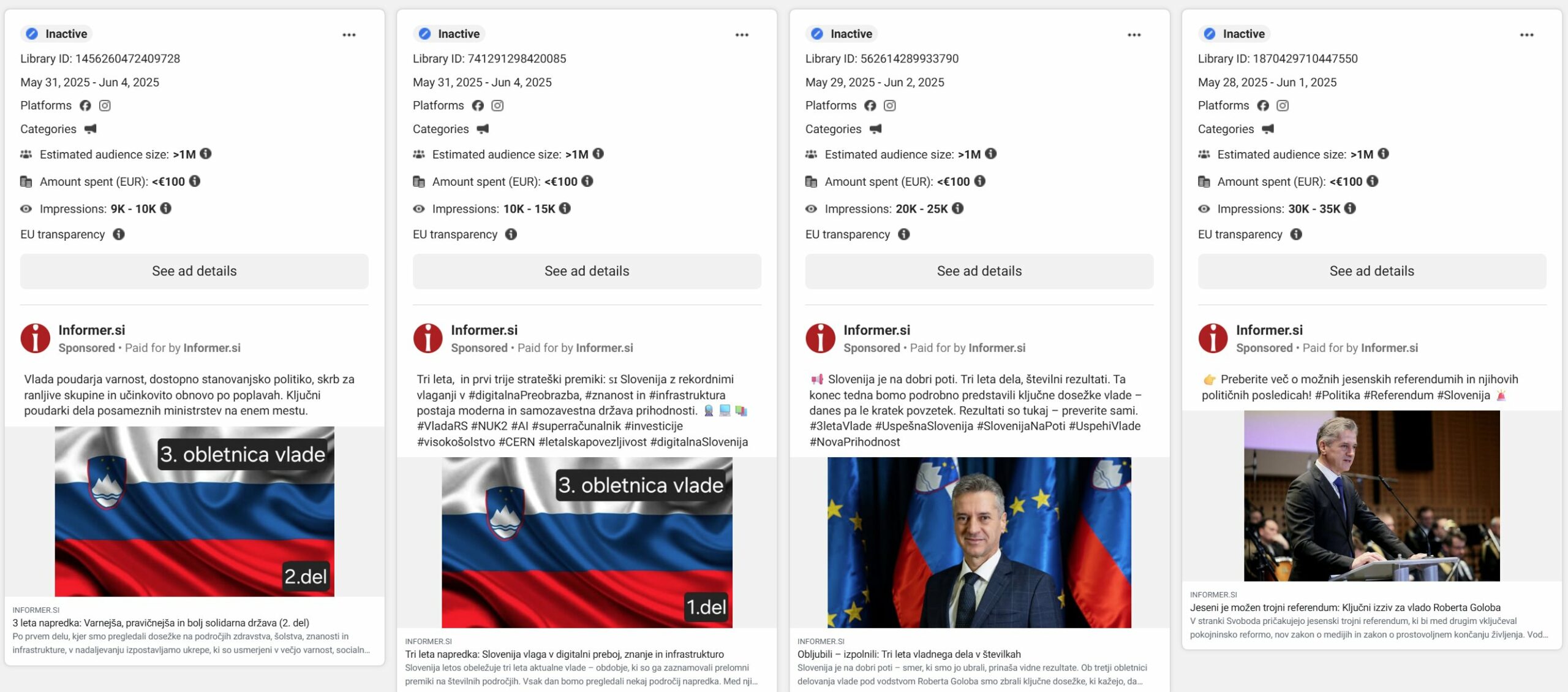 Foto: XDružba DC Limited deluje kot uradni izdajatelj portala Informer, ki je znan po svoji amaterski in patetični naravi. Kljub temu so prihodki podjetja v obdobju Golobove vlade eksplodirali, medtem ko ima praktično brez zaposlenih – kar kaže na možnost fiktivnih poslov. Dodatno so ta sredstva uporabljena za nakup oglasov na Meti, kjer se pojavljata Golob in Žibratova v političnem kontekstu. V Meta Ads Library so ti oglasi javno vidni, vključno z datumi, porabo in vsebino, ki promovira vladne dosežke in stranko Svoboda.