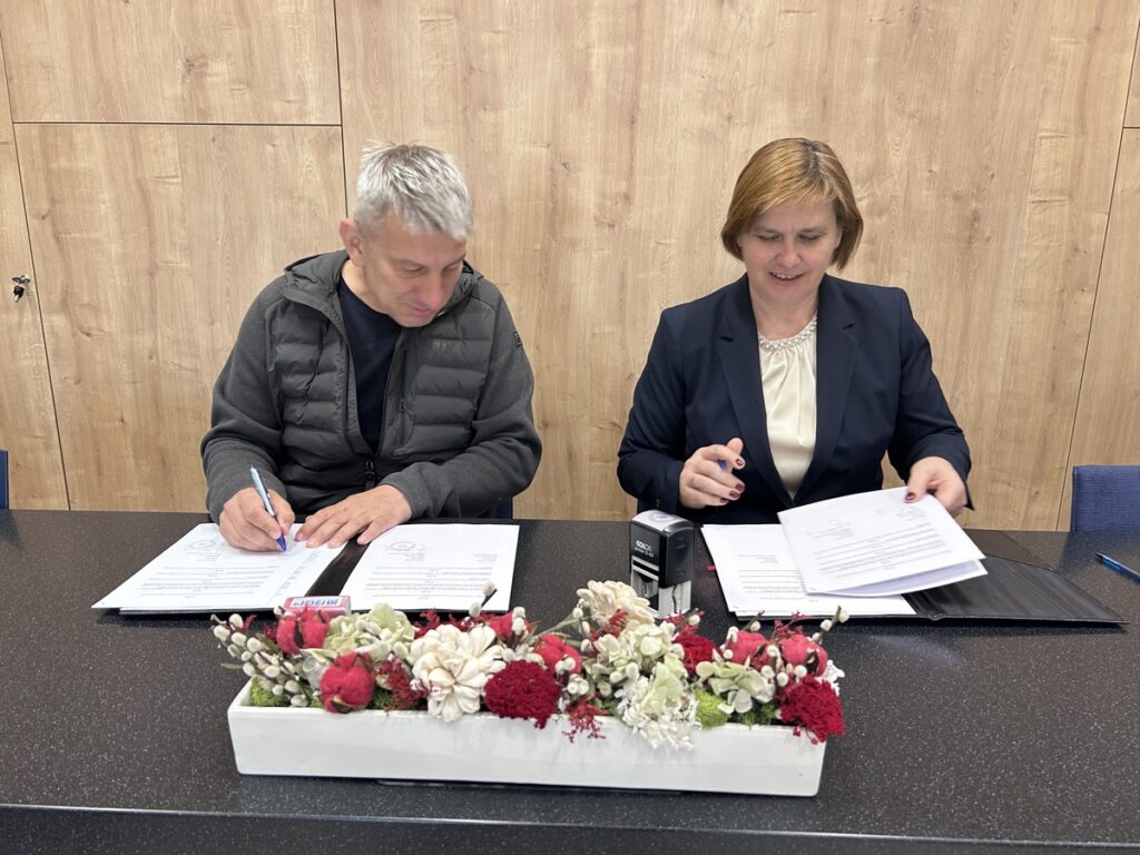 Martina Legan Janžekovič, županja Občina Metlika, in Danijel Špingler, direktor podjetja BGP GRADNJE d. o. o., sta podpisala pogodbo za izvedbo projekta ureditve cestne razsvetljave v naselju Trnovec.