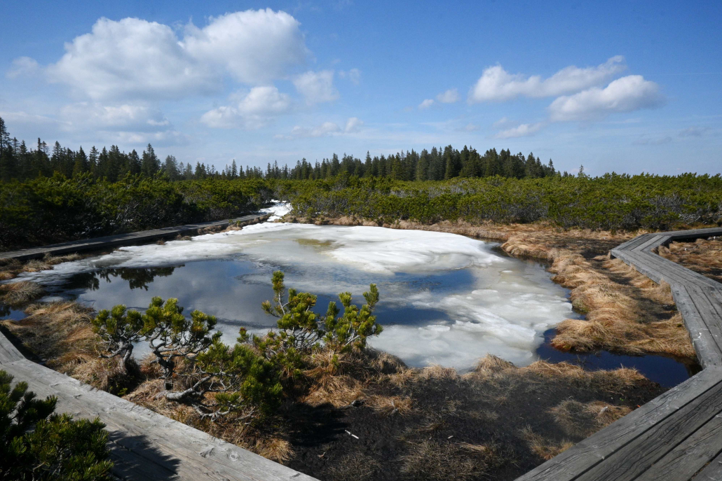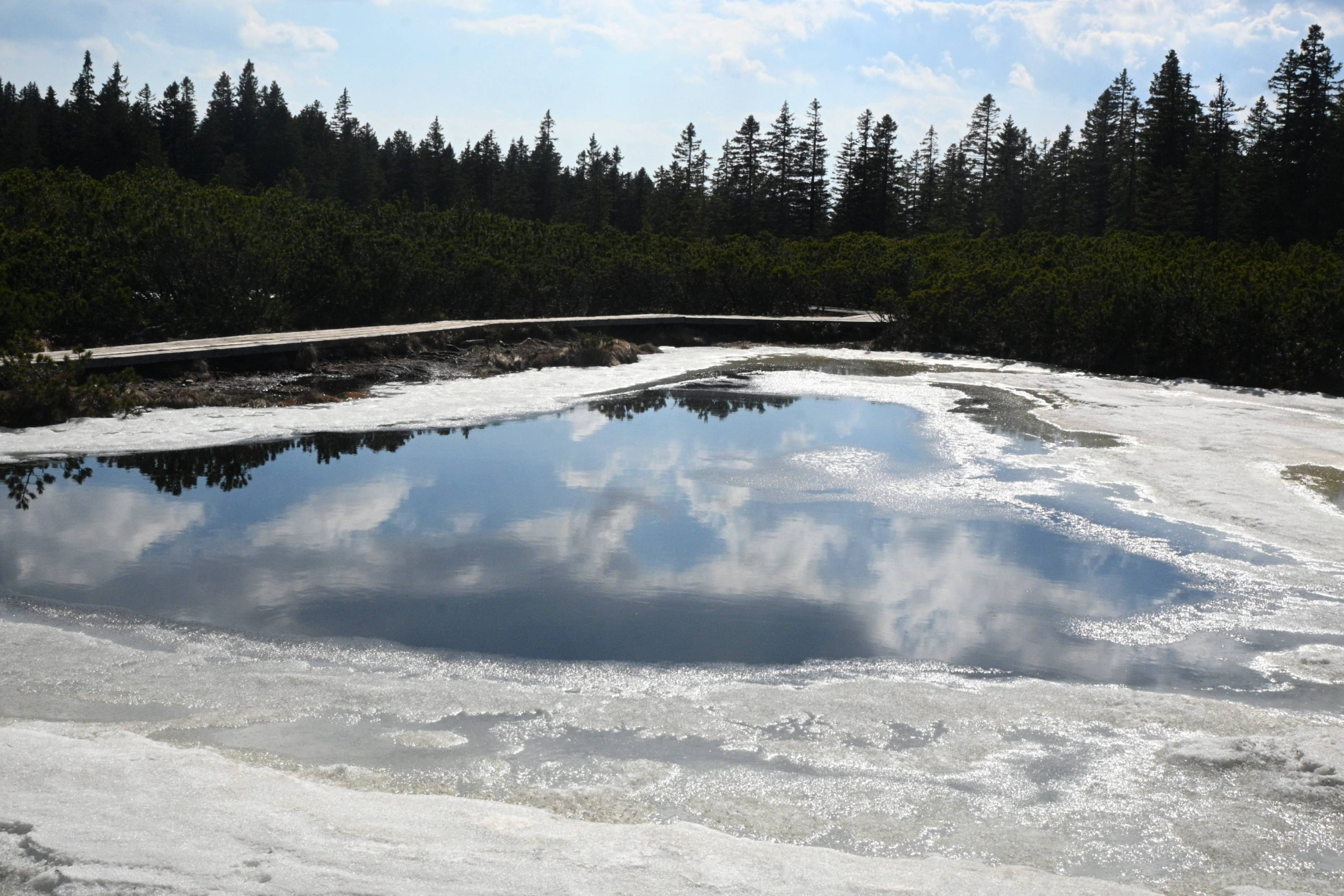 Pot proti Lovrenškim jezerom je v tem času bila še polna snega. Jezera delno zaledenela so se kopala v med rušjem in odsevala nebo in puh oblakov. Zaljubljen sem v lepoto Lovrenških jezer in tišino, mir in spokojnost, ki vladata tu. Kar sedel sem, srkal in se zahvaljeval.