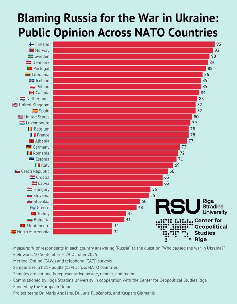 Nedavna akademska raziskava Centra za geopolitične študije Univerze Riga Stradiņš (RSU), financirana s strani Evropske unije in izvedena v obliki nacionalno reprezentativne ankete v državah članicah NATA, odpira zanimiv in hkrati zaskrbljujoč vpogled v to, kako prebivalci dojemajo odgovornost za vojno v Ukrajini.