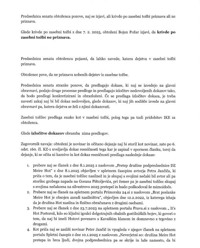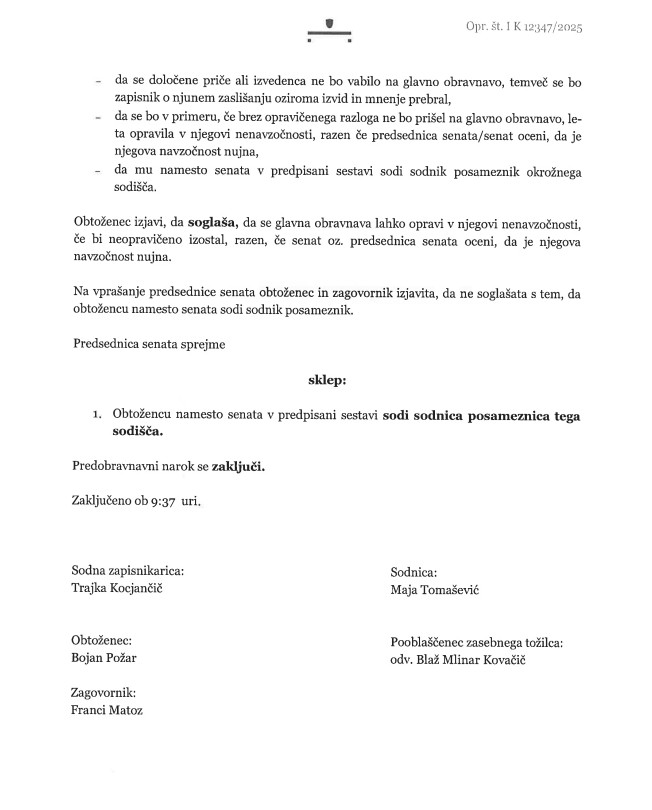 Pooblaščenec zasebnega tožilca je Blaž Kovačič Mlinar, zagovornik obtoženega Bojana Požarja pa odvetnik Franci Matoz. 3. 2. 2026 je v zadevi pri Okrožnem sodišču v Kopru potekal predobravnavni narok, v uredništvo pa smo prejeli zapisnik le-tega. Sodnica je Maja Tomašević. V nadaljevanju smo iz dokumenta izluščili še nekaj pomembnih podatkov.