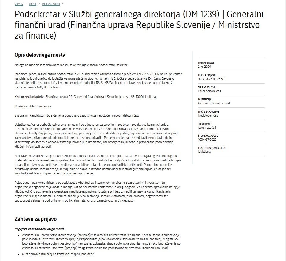 Tokrat pa je v javnosti še en razpis, tokrat za delo podsekretarja v službi generalnega direktorja na Finančnem uradu (Finančna uprava Republike Slovenije / Ministrstvo za finance).