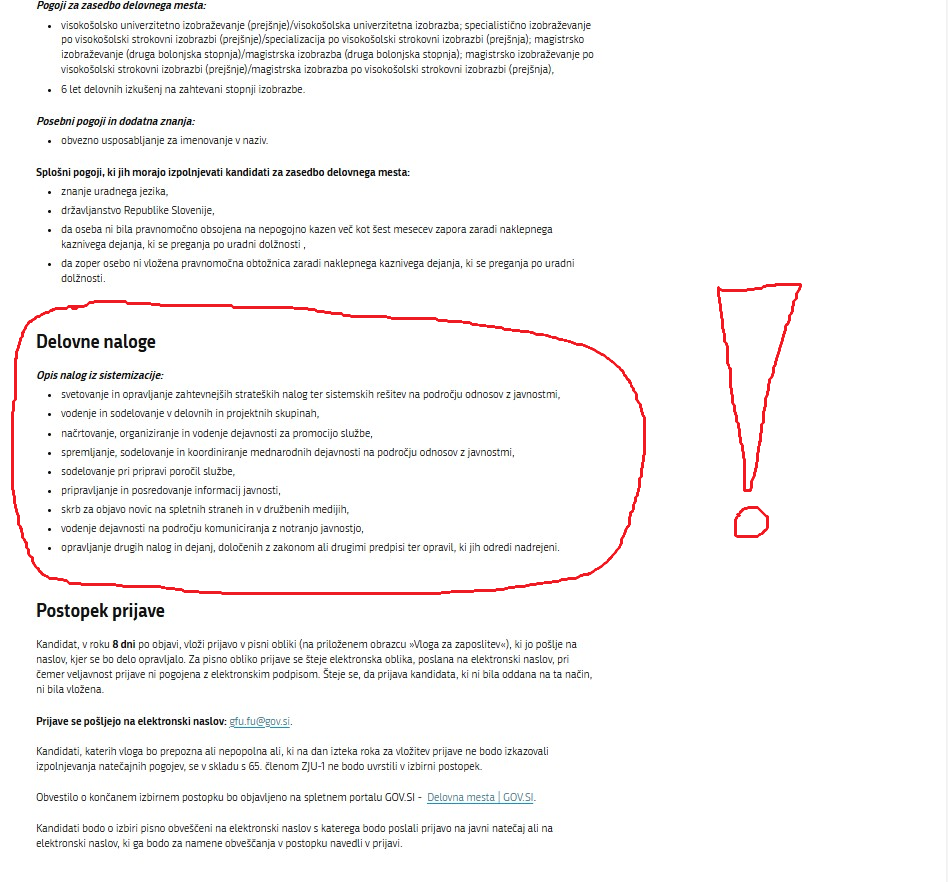 Kot je razvidno iz zgornje povezave (linka) do javnega natečaja, so bile delovne naloge oziroma opis nalog iz sistemizacije sledeče: