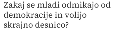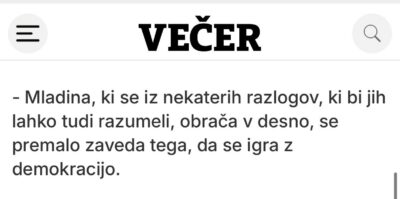 Medijski diskurz je temu primeren. Tranzicijski mediji spreminjajoče se preference najmlajših volivcev razumejo kot anomalijo. Denimo, na Delu so jih predstavili kot nekakšen psihološki problem. Vsaj naslov članka tako namiguje. Na Večeru pa pišejo o grožnji demokraciji. Če združimo ta “razmisleka”, imajo volivci, ki ne volijo tranzicijske levice, psihološke težave in zaradi tega ogrožajo demokracijo.
