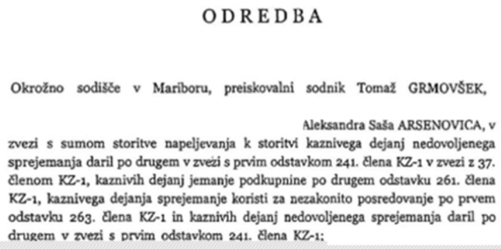 Mariborski župan Saša Arsenović je osumljen več kaznivih dejanj, med drugim tudi jemanja podkupnine. Tako piše v sodni odredbi, so bili zoper Arsenovića in druge osumljene odrejeni prikriti preiskovalni ukrepi, med njimi tajno opazovanje ter nadzor elektronskih komunikacij s prisluškovanjem in snemanjem. konkretno naj bi bil Arsenović utemeljeno osumljen napeljevanja h kaznivemu dejanju nedovoljenega sprejemanja daril, jemanja podkupnine, sprejemanja koristi za nezakonito posredovanje in nedovoljenega sprejemanja daril.