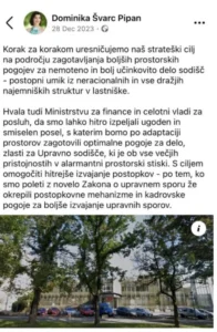 Vir: FacebookV kolikor predpostavljamo, kar se zdi skoraj nemogoče, da ministrica ni bila seznanjena s pomanjkljivostmi stavbe, potem ne moremo priti do drugačnega zaključka, kot da je ravnala izredno malomarno, saj se o večji investiciji ministrstva očitno sploh ni pozanimala.