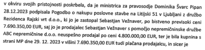 Predvsem pa bode v oči, da del kazenske ovadbe nista drugi dve ključni osebi, poleg Dominike Švarc Pipan, in sicer finančni minister Klemen Boštjančič in predsednik vlade Robert Golob. Zakaj? Prav finančni minister je bil ključen pri tem, da so se zagotovila sredstva za nakup stavbe. Nakup namreč ni bil načrtovan v državnem proračunu za leto 2023 niti v dveh rebalansih proračuna, zanj posledično ni imel zagotovljenih sredstev in investicijske dokumentacije, denar za nakup pa je bil zagotovljen kar iz proračunske rezerve. Računsko sodišče je ugotovilo, da je ministrstvo kršilo zakon o javnih financah.