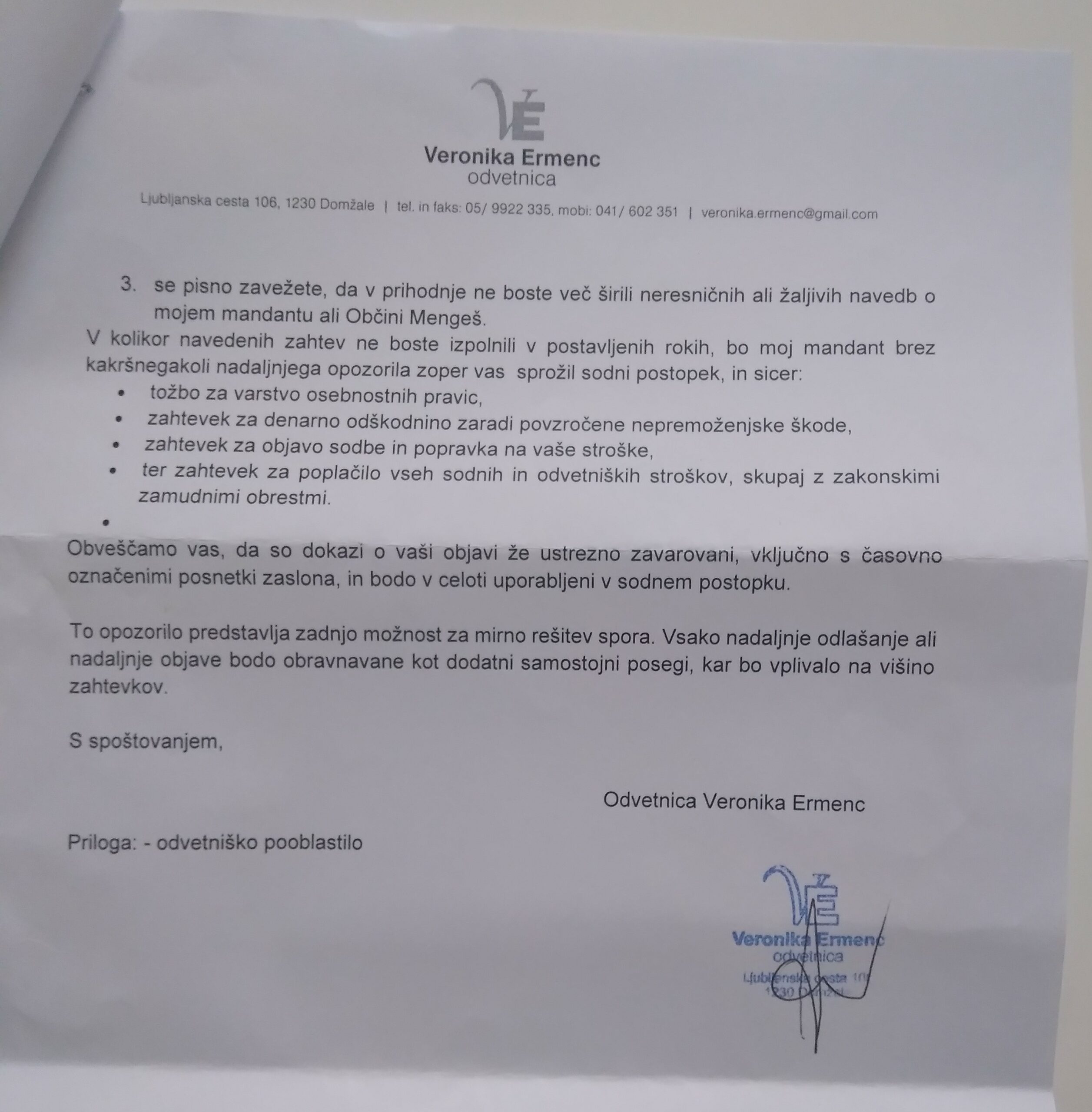 Opozorilo je poslano “v imenu in po pooblastilu” župana Boga Ropotarja, kar odpira vprašanje, ali se storitve odvetnice financirajo iz občinskega proračuna (torej iz davkoplačevalskega denarja) ali gre za zasebno ureditev.