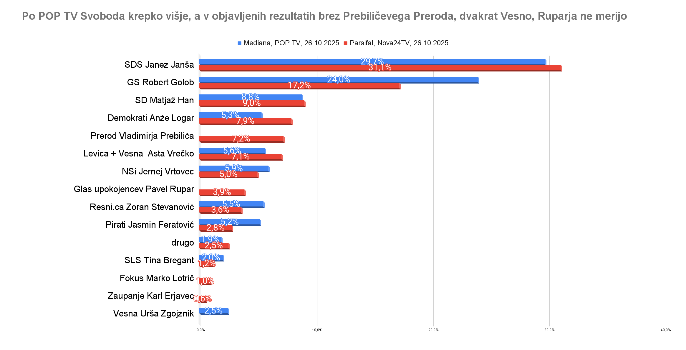 Primerjava prvih objavljenih podatkov POP TV z rezultati Parsifala za Nova24TV, ki je merila Levico in Vesno združeno, ker napovedujejo skupen nastop na volitvah, v naboru pa ima nekaj več strank kot Mediana, je takšna: