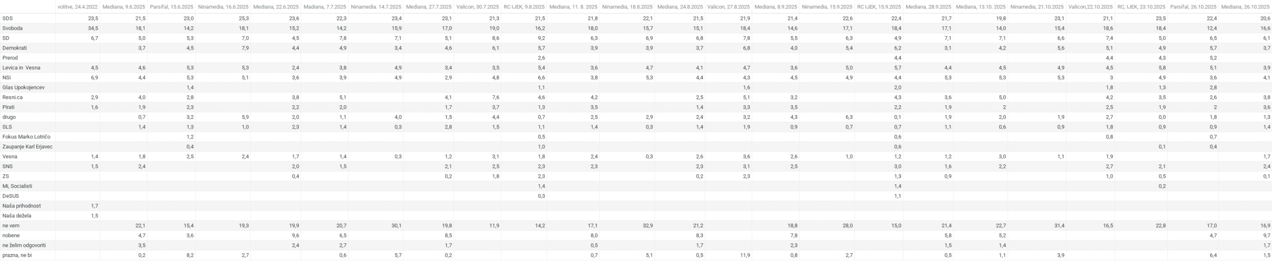 V grafikah in članku v Spletnem časopisu so deleži podpore strankam preračunani tako, da so upoštevani le za stranke opredeljeni volivci. To omogoča primerjavo z volitvami in med raziskavami. Med opredeljene za stranke štejem tudi izbiro “druge” stranke. To so praviloma tiste, ki anketiranim niso ponujene, se jih pa sami spomnijo. Izvirni deleži podpore strankam različnih raziskav, kot so jih objavili mediji, ki so temelj za preračune, so objavljeni v preglednici: