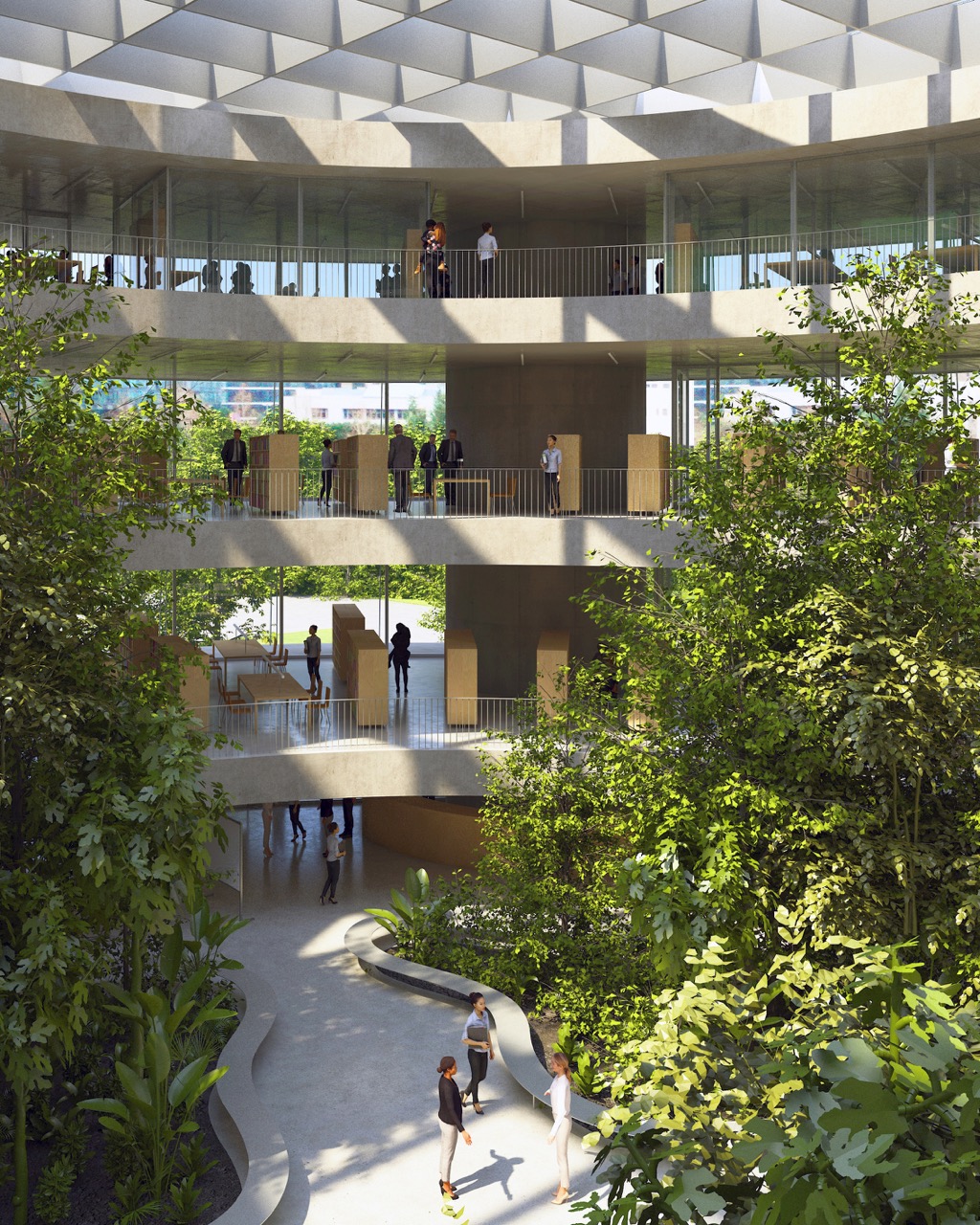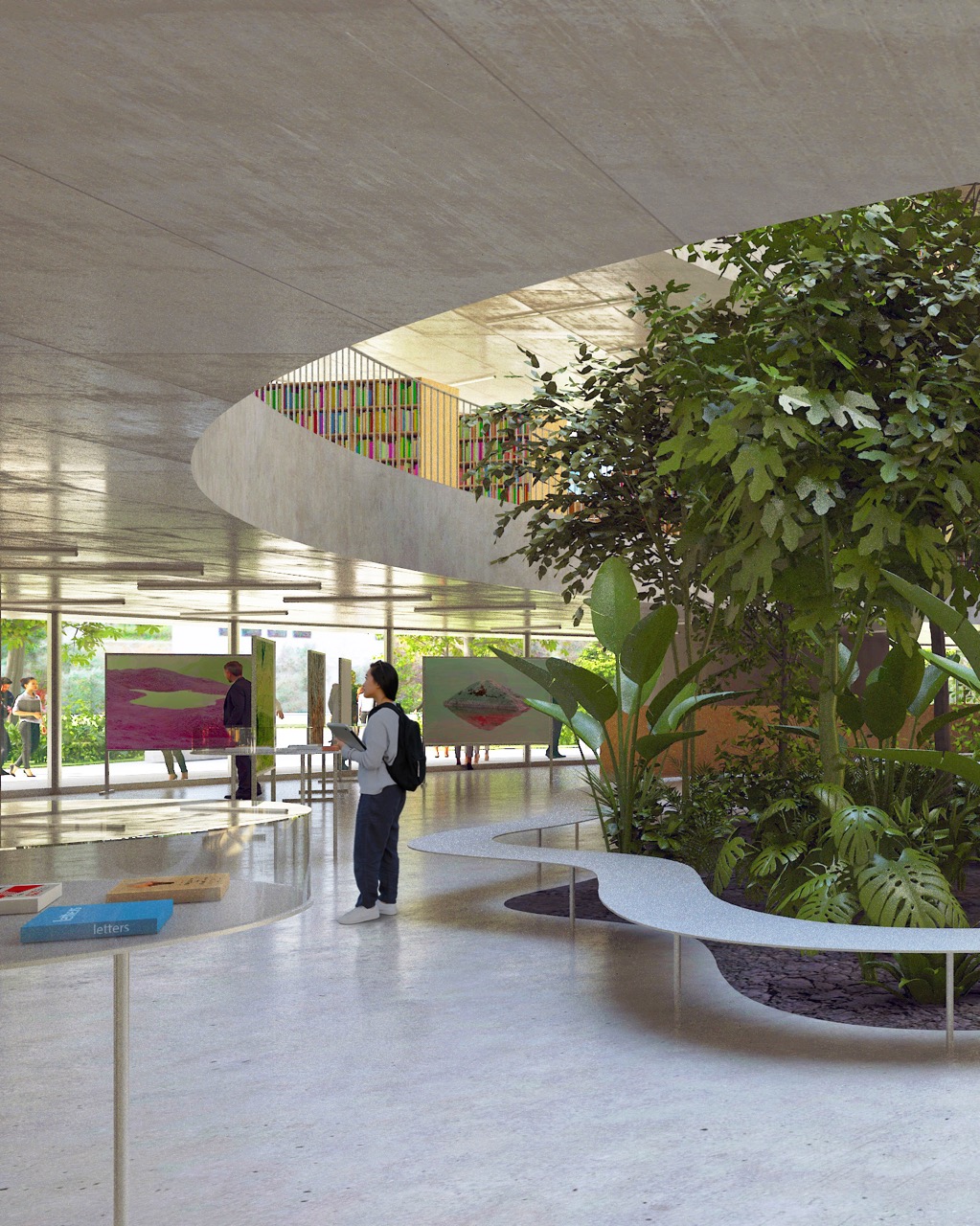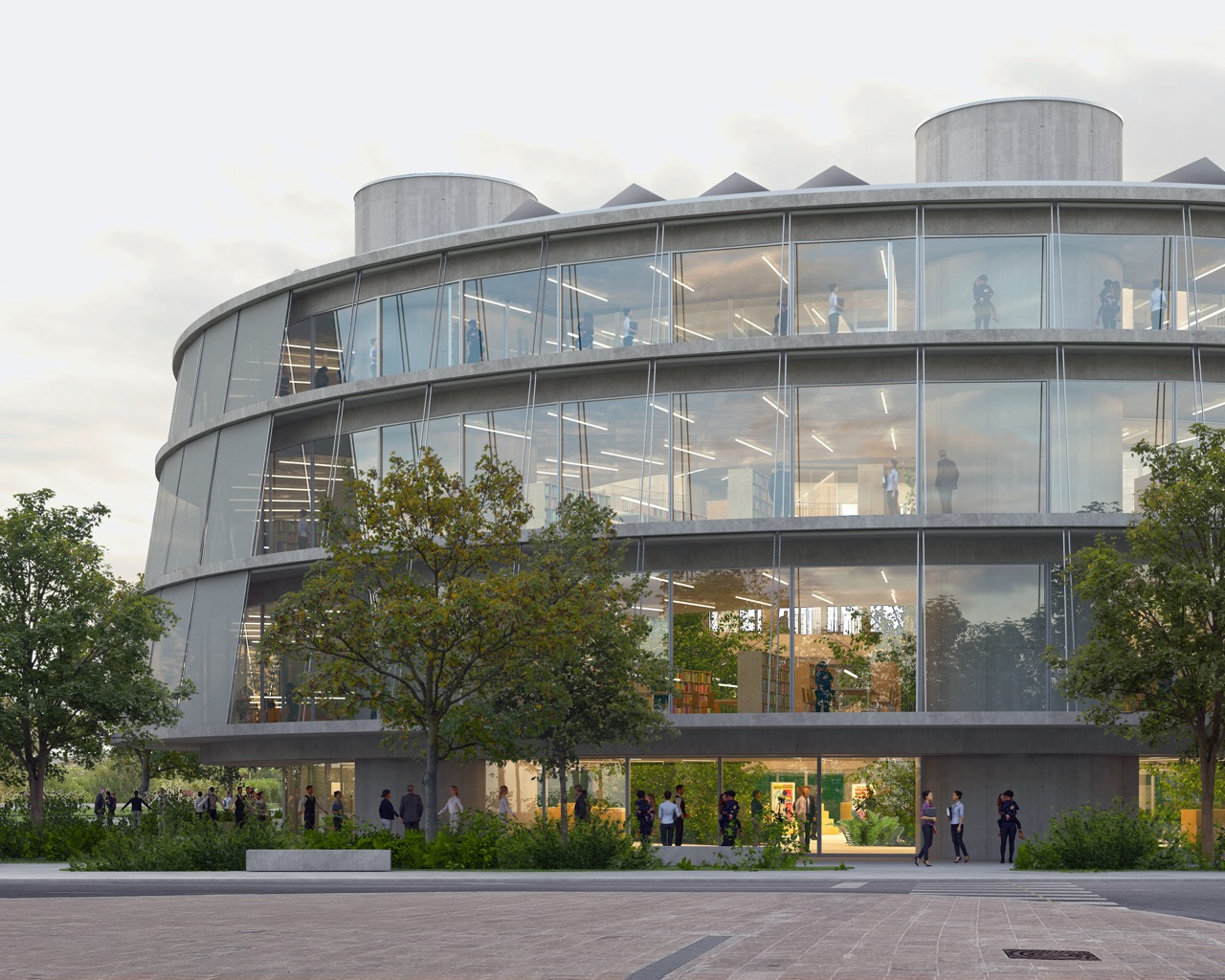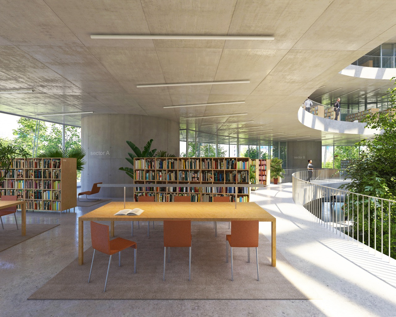 Nova knjižnica se s svojo preprosto, krožno obliko razlikuje od strukture okoliških pravokotnih fakultetnih stavb. Zasnova stavbe s centralno, krožno organizirano postavitvijo omogoča dostop z vseh strani. Program je organiziran okoli odprtega tlorisa. To odprtost omogoča preprost konstrukcijski sistem: betonske plošče, ki jih podpira sedem okroglih jeder. Vhodi vodijo v prostorno avlo – osrednji javni prostor, ki služi kot orientacijsko središče stavbe, kjer je 16 metrov visok zeleni atrij, ki vertikalno povezuje vsa nadstropja. Poln subtropskih in mediteranskih rastlin je sestavni del sistema za regulacijo klime v stavbi. Čitalnice v nadstropjih so zasnovane kot odprt prostor med posameznimi zaprtimi programskimi enotami. Velike zastekljene fasade odpirajo notranjost navzven proti krošnjam dreves in proti osrednjemu zelenemu atriju. Poudarjena je ideja branja in učenja med krošnjami dreves. Široko stopnišče povezuje nadstropja in tvori krožno pot okoli atrija. V pritličju se stopnišče spusti v klet z mehko oblikovanim preddverjem pred avditorijem. Skladišča in arhiv knjižnice se prav tako nahajajo v kleti. Zasnova sledi načelu iskrenega prikaza materialov gradnje. Talne plošče in vertikalna jedra so izdelana iz vidnega betona, vidnega od zunaj in od znotraj. Fasada je zasteklena z okni v polni višini, ki omogočajo, da se konture zelenega okolja razširijo v notranjost.