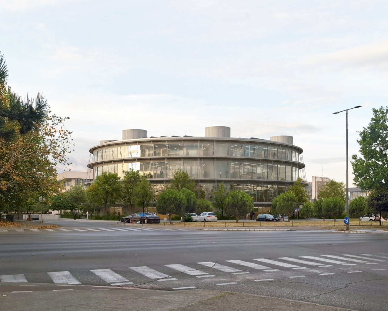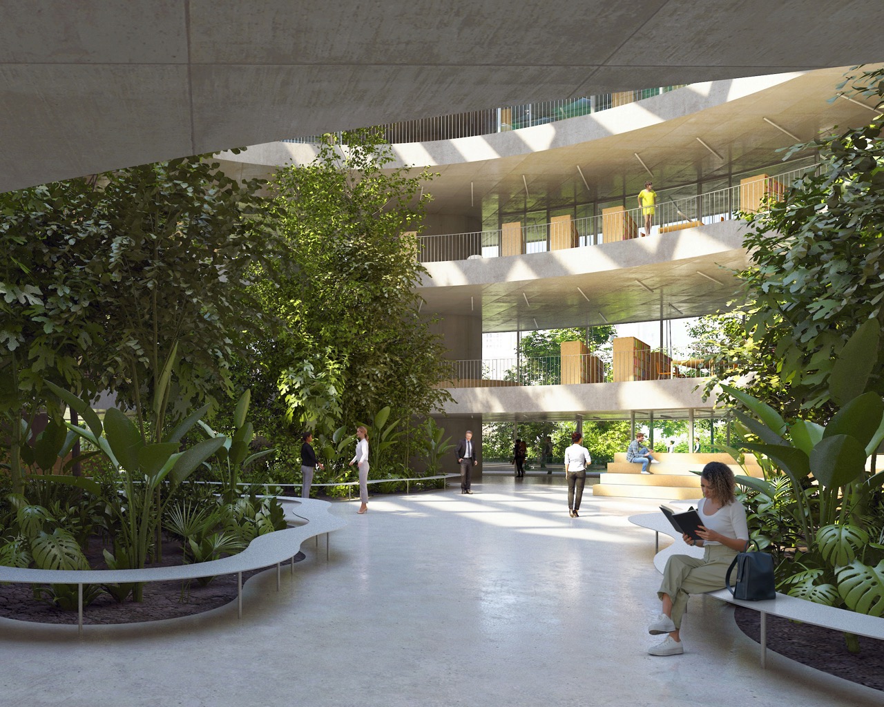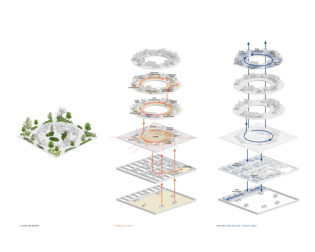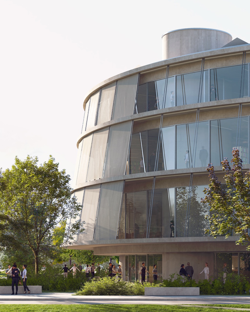 Nova knjižnica se s svojo preprosto, krožno obliko razlikuje od strukture okoliških pravokotnih fakultetnih stavb. Zasnova stavbe s centralno, krožno organizirano postavitvijo omogoča dostop z vseh strani. Program je organiziran okoli odprtega tlorisa. To odprtost omogoča preprost konstrukcijski sistem: betonske plošče, ki jih podpira sedem okroglih jeder. Vhodi vodijo v prostorno avlo – osrednji javni prostor, ki služi kot orientacijsko središče stavbe, kjer je 16 metrov visok zeleni atrij, ki vertikalno povezuje vsa nadstropja. Poln subtropskih in mediteranskih rastlin je sestavni del sistema za regulacijo klime v stavbi. Čitalnice v nadstropjih so zasnovane kot odprt prostor med posameznimi zaprtimi programskimi enotami. Velike zastekljene fasade odpirajo notranjost navzven proti krošnjam dreves in proti osrednjemu zelenemu atriju. Poudarjena je ideja branja in učenja med krošnjami dreves. Široko stopnišče povezuje nadstropja in tvori krožno pot okoli atrija. V pritličju se stopnišče spusti v klet z mehko oblikovanim preddverjem pred avditorijem. Skladišča in arhiv knjižnice se prav tako nahajajo v kleti. Zasnova sledi načelu iskrenega prikaza materialov gradnje. Talne plošče in vertikalna jedra so izdelana iz vidnega betona, vidnega od zunaj in od znotraj. Fasada je zasteklena z okni v polni višini, ki omogočajo, da se konture zelenega okolja razširijo v notranjost.