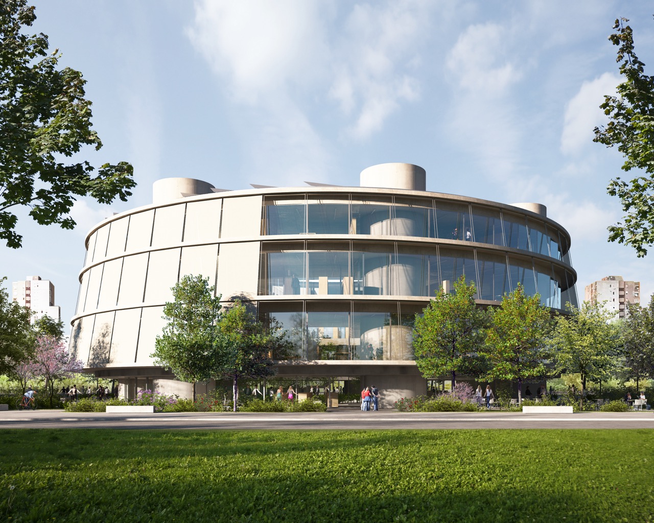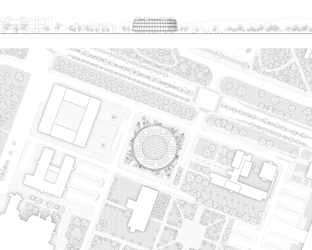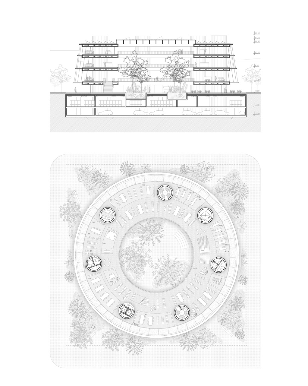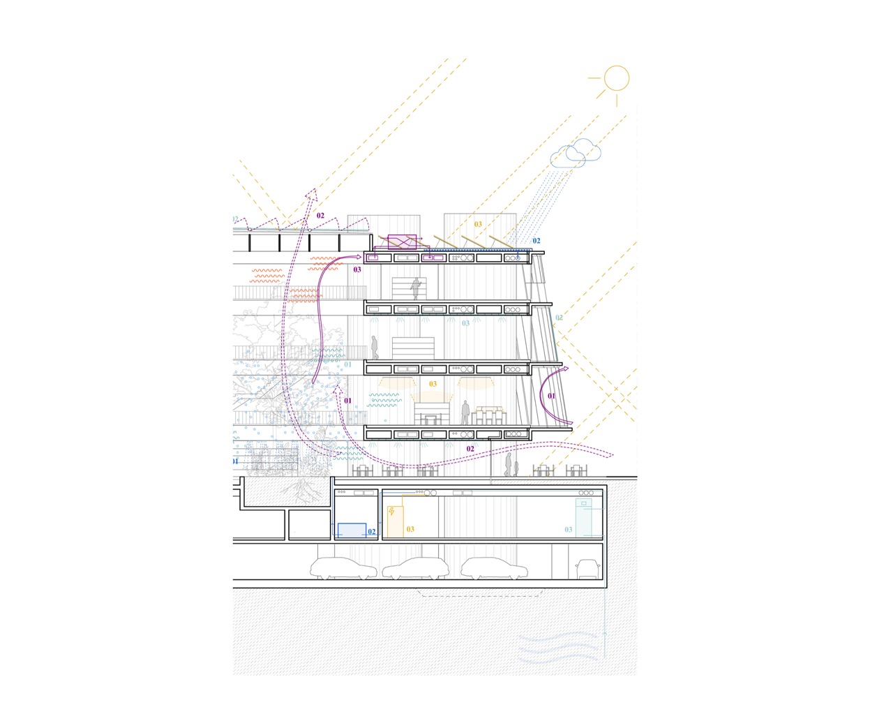 Nova knjižnica se s svojo preprosto, krožno obliko razlikuje od strukture okoliških pravokotnih fakultetnih stavb. Zasnova stavbe s centralno, krožno organizirano postavitvijo omogoča dostop z vseh strani. Program je organiziran okoli odprtega tlorisa. To odprtost omogoča preprost konstrukcijski sistem: betonske plošče, ki jih podpira sedem okroglih jeder. Vhodi vodijo v prostorno avlo – osrednji javni prostor, ki služi kot orientacijsko središče stavbe, kjer je 16 metrov visok zeleni atrij, ki vertikalno povezuje vsa nadstropja. Poln subtropskih in mediteranskih rastlin je sestavni del sistema za regulacijo klime v stavbi. Čitalnice v nadstropjih so zasnovane kot odprt prostor med posameznimi zaprtimi programskimi enotami. Velike zastekljene fasade odpirajo notranjost navzven proti krošnjam dreves in proti osrednjemu zelenemu atriju. Poudarjena je ideja branja in učenja med krošnjami dreves. Široko stopnišče povezuje nadstropja in tvori krožno pot okoli atrija. V pritličju se stopnišče spusti v klet z mehko oblikovanim preddverjem pred avditorijem. Skladišča in arhiv knjižnice se prav tako nahajajo v kleti. Zasnova sledi načelu iskrenega prikaza materialov gradnje. Talne plošče in vertikalna jedra so izdelana iz vidnega betona, vidnega od zunaj in od znotraj. Fasada je zasteklena z okni v polni višini, ki omogočajo, da se konture zelenega okolja razširijo v notranjost.