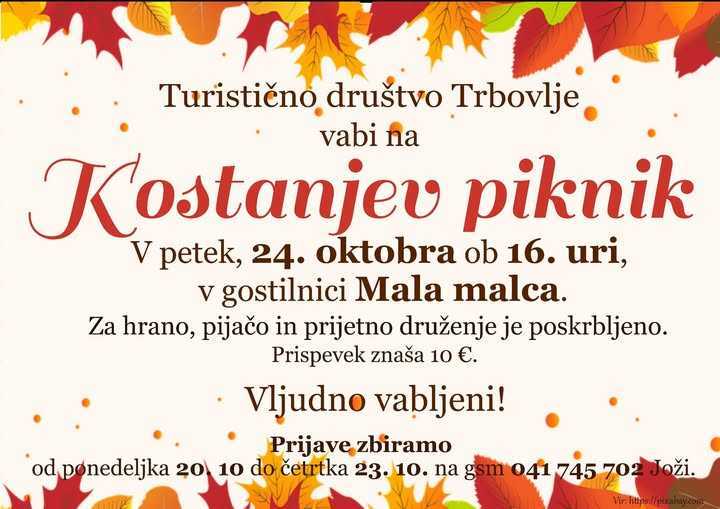 Turistično društvo Trbovlje pripravlja danes ob 16. uri tradicionalni kostanjev piknik v gostilnici Mala malca. Za dobro hrano, pijačo in prijetno druženje bo poskrbljeno. »Vljudno vabljeni, da skupaj ob prijetnih jesenskih okusih pozdravimo jesen,« vabijo organizatorji.