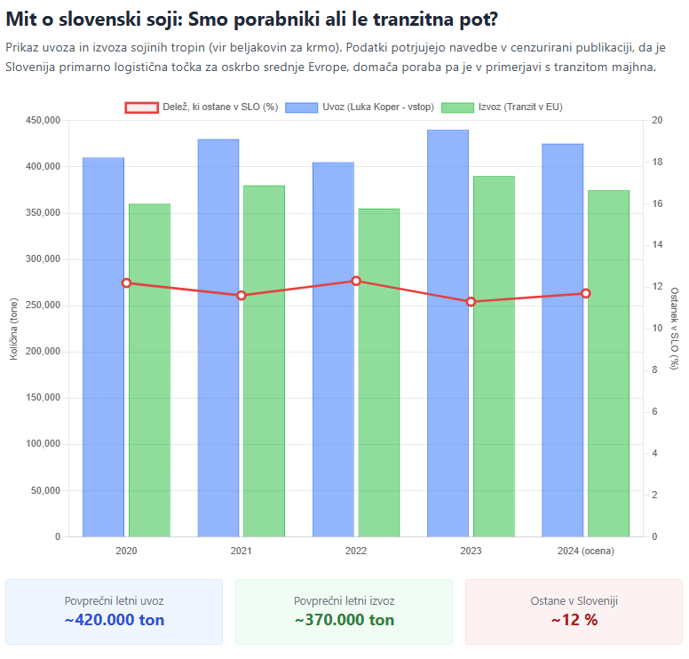 Avtorji poročila se dotaknejo tudi pogosto uporabljanega argumenta o uvozu soje zaradi katere naj bi trpel amazonski pragozd. Pojasnjujejo, da Slovenija za krmo živali ne uvaža sojinega zrnja, temveč sojine tropine, ki so stranski produkt pri proizvodnji olja. Poleg tega večina soje, ki pride v Luko Koper, ni namenjena slovenski porabi, temveč tranzitu v države, kot sta Avstrija in Madžarska. Kljub temu se v javnosti pogosto ustvarja vtis, da slovenska živinoreja neposredno prispeva k uničevanju Amazonije.