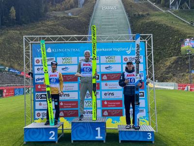 Svetovni prvak v smučarskih skokih Domen Prevc, ki je v soboto na tekmi celinskega pokala v Klingenthalu skočil do rekorda naprave (152 m), nato pa je bil diskvalificiran zaradi neustreznega dresa, je danes stal na stopničkah. Prevc je v vetrovni loteriji zasedel tretje mesto, Rok Oblak pa je bil deseti.