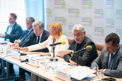 Minister za gospodarstvo Matjaž Han na sestanku z GZS, foto: STAGZS poudarja, da je Slovenija zelo odprto, izvozno naravnano gospodarstvo, zato šibkost v EU (zlasti v Nemčiji; avtomobilska industrija) hitro udari po nas. Pozivajo k nujnim ukrepom: davčni reformi, razbremenitvi dela in podjetij, izboljšanju poslovnega okolja ter stabilni razvojni vladi. Brez tega Slovenija ne bo dohitela EU. V začetku leta 2026 so opozorili tudi na prekomerne dvige minimalne plače, ki dodatno obremenjujejo izvoznike.