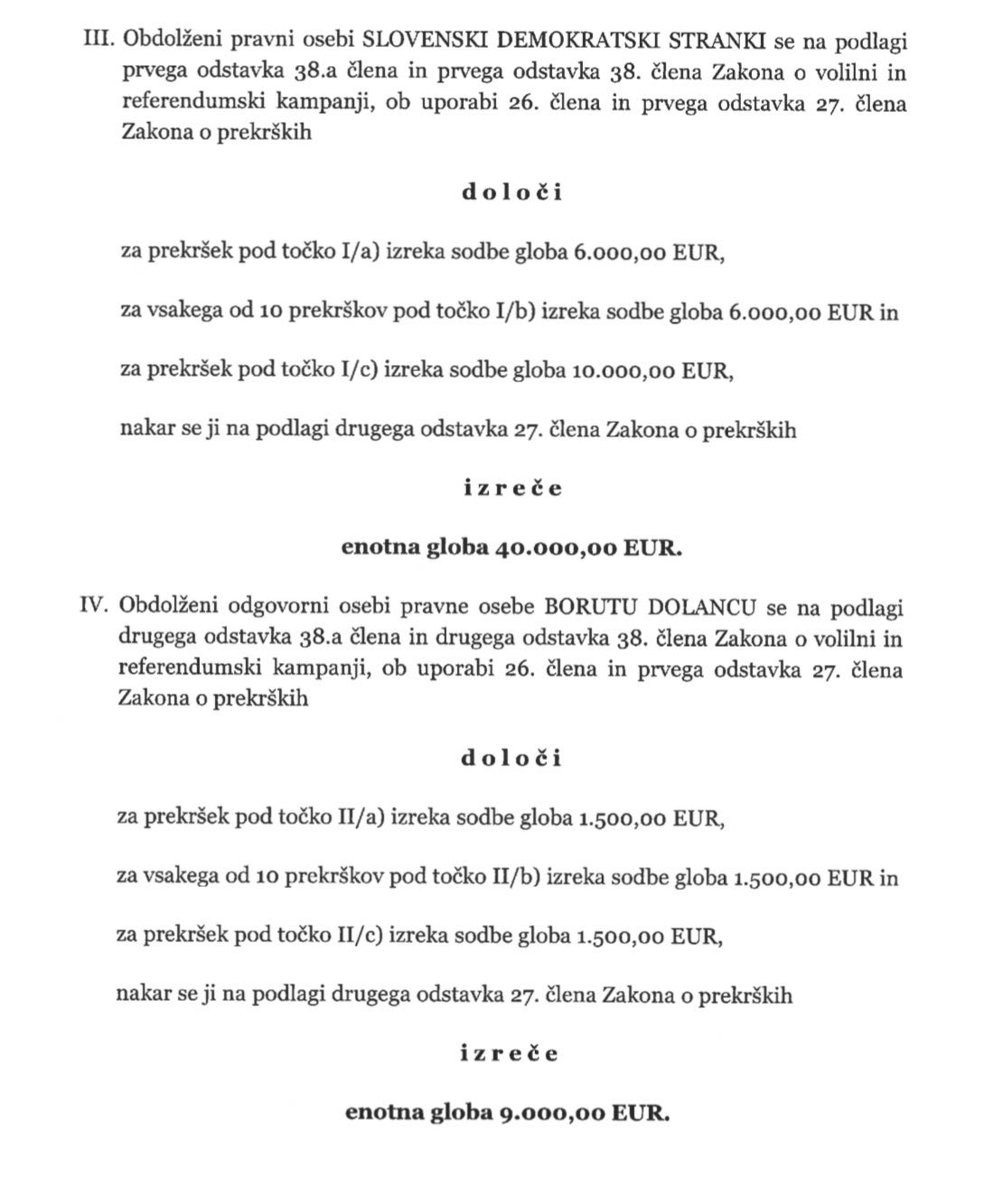 SDS je v vsaki kampanji priznala tudi napake, če so bile, opravila popravljalne ukrepe in tudi plačala kazni. Ob tisočih računih in zapleteni zakonodaji se vedno zgodi kaka pomanjkljivost, še posebej pri kandidatih, ki so prvič v tej vlogi. Problem te konkretne sodbe pa je v dejstvu, da so bile podobne in tudi mnogo večje pomanjkljivosti prisotne (in deloma tudi odkrite, oglejte si poročila RS na spletu) tudi pri večini drugih strank, sodilo pa se je zgolj SDS in naložilo drastično kazen za banalne prekrške, tudi take v vredosti 2 ali 5 evrov. Važno, da isto sodišče lahko Jankoviču odpiše 20 ali 40 milijonov dolga.”