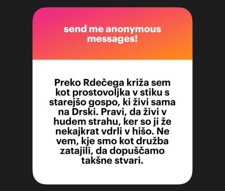 Druga zgodba prihaja od prostovoljke Rdečega križa, ki je v stiku z gospo z Drske: “Preko Rdečega križa sem kot prostovoljka v stiku s starejšo gospo, ki živi sama na Drski. Pravi, da živi v hudem strahu, ker so ji že nekajkrat vdrli v hišo. Ne vem, kje smo kot družba zatajili, da dopuščamo takšne stvari.”