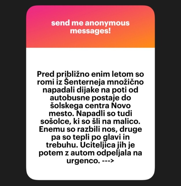 Še ena zgodba opisuje dogodek pred približno letom dni, ko so dijake na poti proti Šolskemu centru Novo mesto napadli: “Pred približno enim letom so romi iz Šentjerneja množično napadali dijake na poti od avtobusne postaje do šolskega centra Novo mesto. Napadli so tudi sošolce, ki so šli na malico. Enemu so razbili nos, druge pa tepli po glavi in trebuhu. Učiteljica jih je potem z avtom odpeljala na urgenco.”