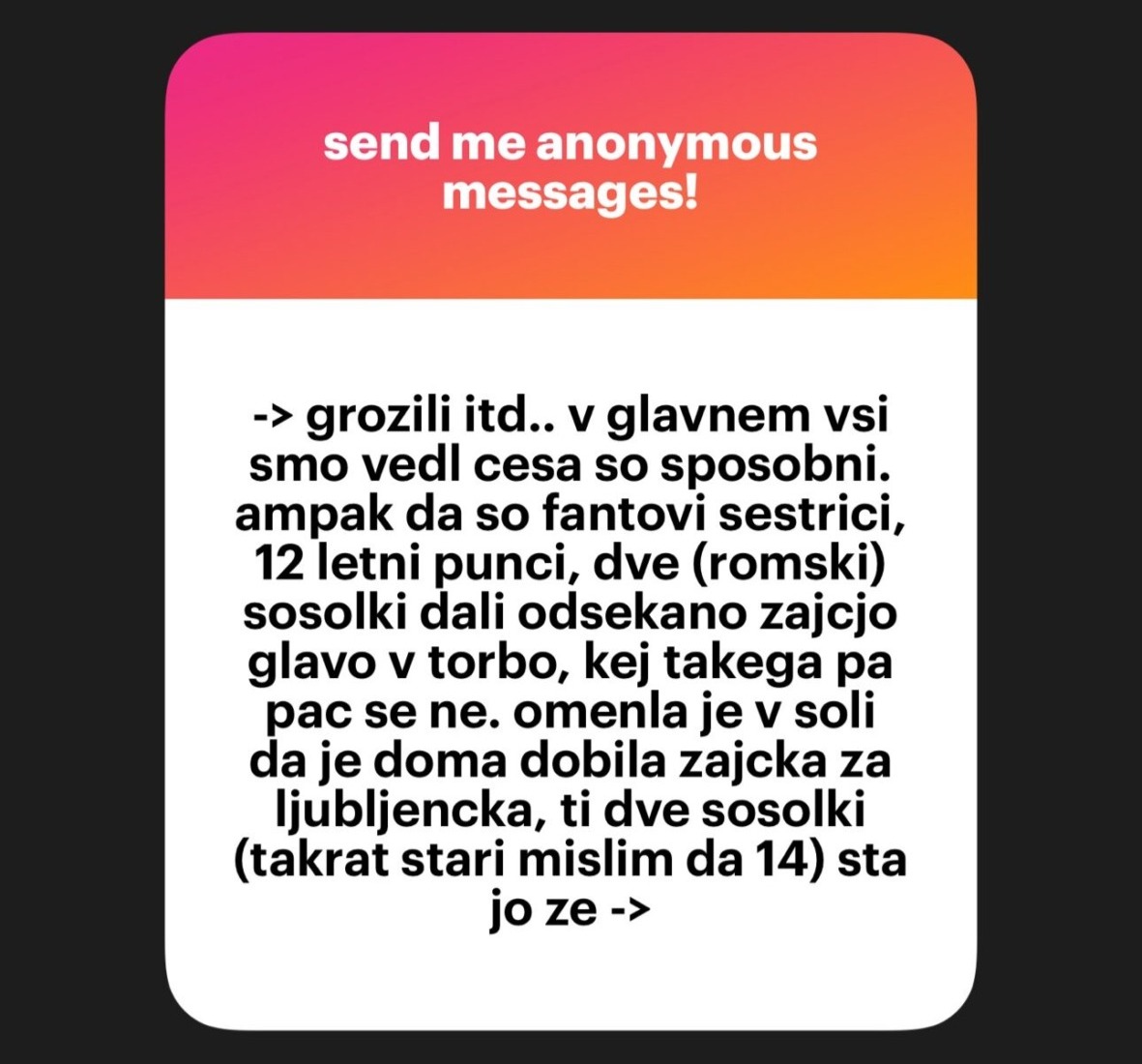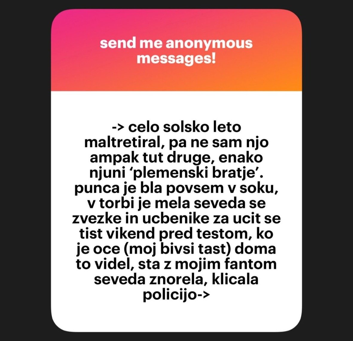 Danes se je pojavila še ena pretresljiva anonimna izpoved, ki razgalja razmere v Novem mestu in okolici. Avtorica je opisala dogajanje iz časa po epidemiji covida, ko je imela fanta iz Šentjerneja. »Iz faksa sem se ob petkih pogosto vozila k njemu, k sreči sem že imela svoj avto in sem večkrat po poti iz šole pobrala še njegovo mlajšo sestro, takrat šestošolko,« piše. Deklica je bila po njenem pričevanju več mesecev tarča nadlegovanja, groženj in nasilja s strani sošolcev.