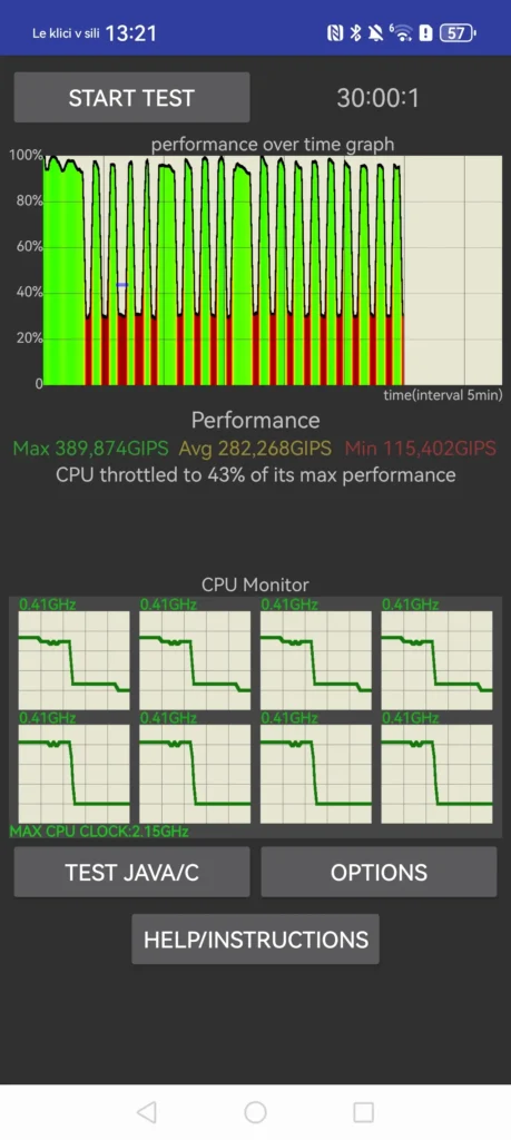 Za večino ima Pura 80 vrh glave zmogljivosti. O tem ni treba dvomiti. Zdi pa se, da niso dovolj pozornosti namenili učinkovitejšemu hlajenju oziroma je to žrtev želje po čim lepšem in bleščečem ohišju ter uporabljenih materialih. Obremenitveni test konkretno segreje hrbtišče in dokaj kmalu se pojavijo strmi, čeprav kratki, padci hitrosti jeder. Če se zgodijo, ko telefon poganja grafično zahtevno mobilno igro, vplivajo na igralno izkušnjo. Med krajšimi igralnimi seansami je to manj verjetno, a po uri intenzivnega igranja se zaradi segrevanja morebiti pojavijo težave.