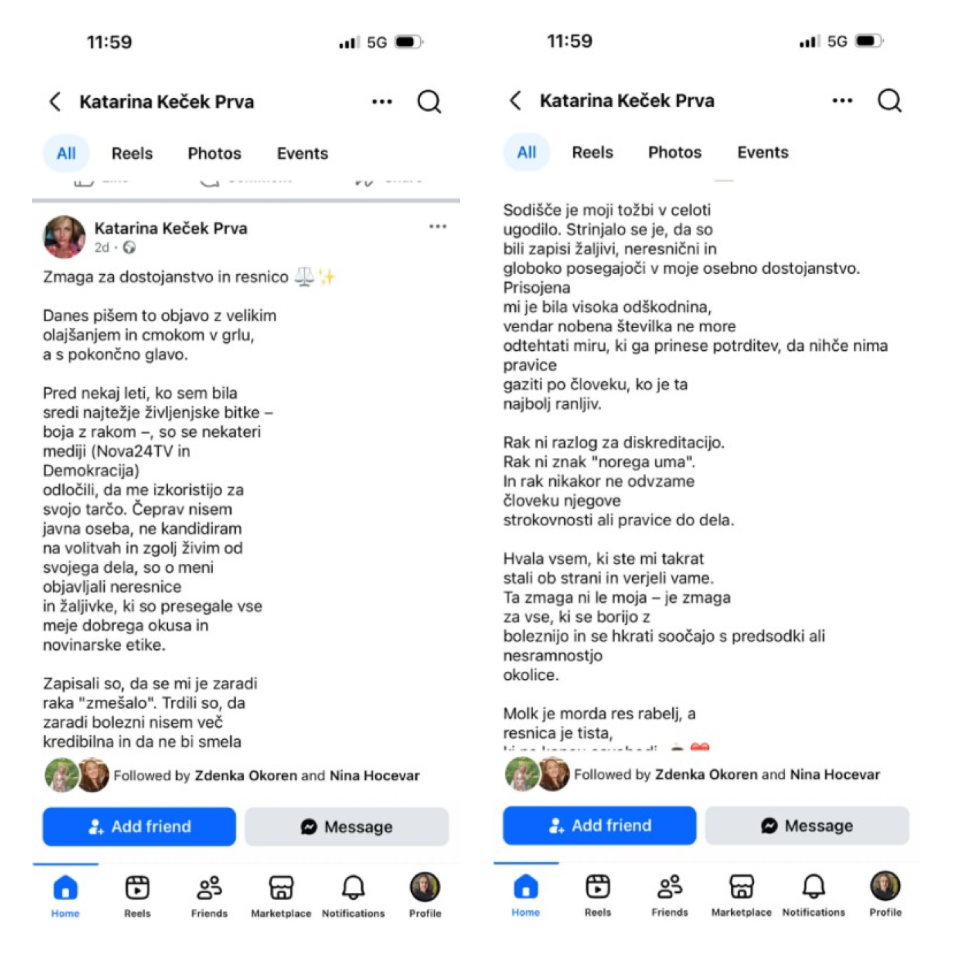 Kot v nadaljevanju še pravi, je Kečkova 11. marca 2026 na svojem profilu na Facebooku preuranjeno objavila sodbo, ki je sodnica uradno sploh še ni spisala. V tej, takratni farsi je bil po njegovem očitno vpleten tudi njen odvetnik, dobro znani dr. Urban Vrtačnik – kajti kako bi sicer Katarina Keček vedela za sodbo (proti Vodebu), če ta sploh še ni bila spisana?