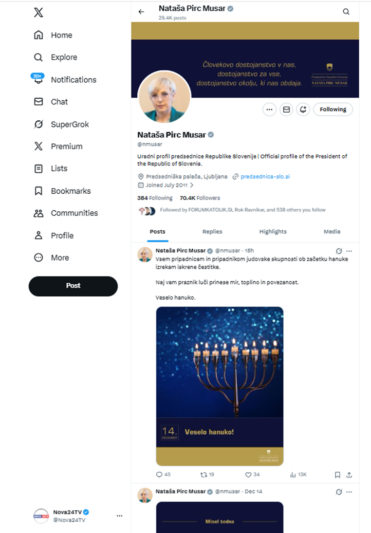 V času, ko se svet sooča z novim valom nasilja, usmerjenega proti judovskim skupnostim, je vsaka javna beseda državnih voditeljev pod drobnogledom. Prav zato je objava predsednice Republike Slovenije Nataše Pirc Musar ob začetku judovskega praznika hanuke sprožila veliko ogorčenje.