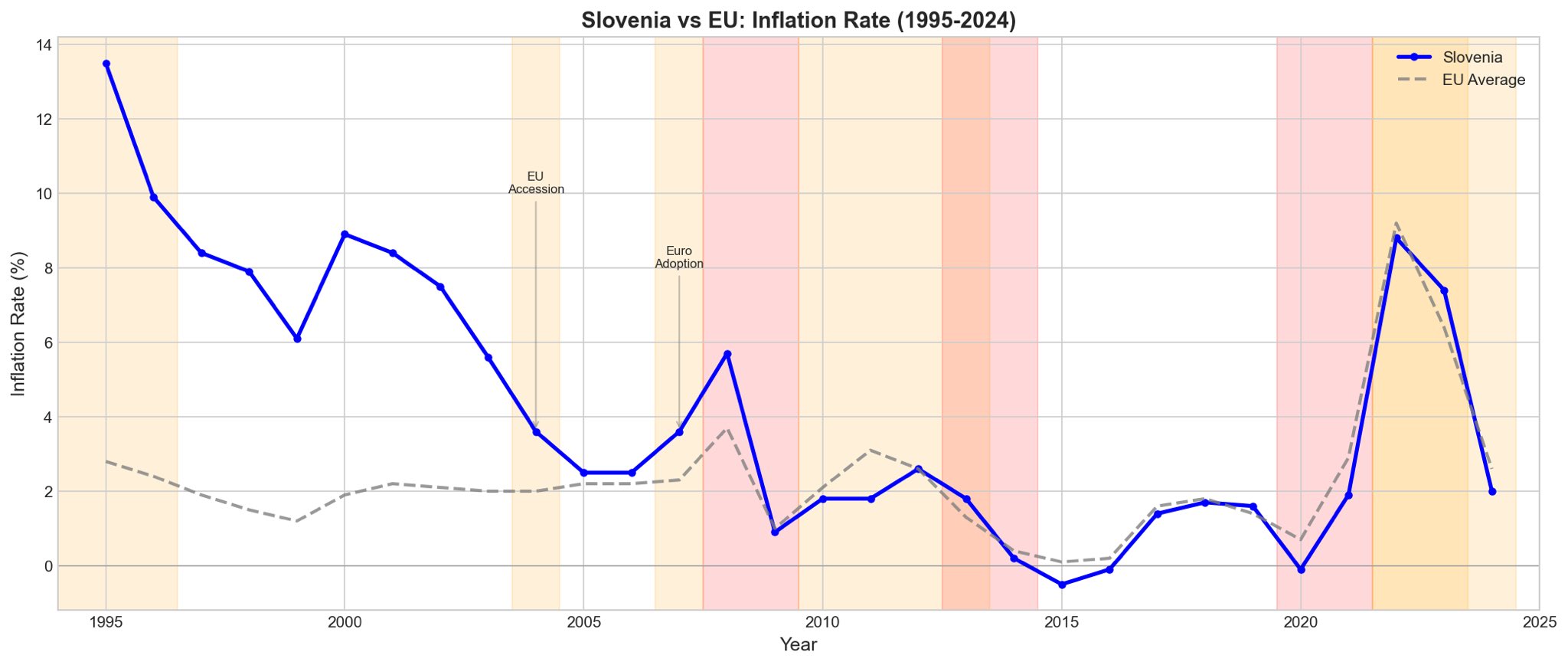 Foto: XZgodovinski graf inflacije v Sloveniji v primerjavi z EU (1995–2024) jasno kaže, kako smo se po hiperinflaciji 90. let in vstopu v evrozono stabilizirali. Od 2008 do 2021 je bila slovenska inflacija pogosto nižja od EU povprečja – to je bil ključ do stabilnosti, nižjih obresti in privlačnosti za investitorje.