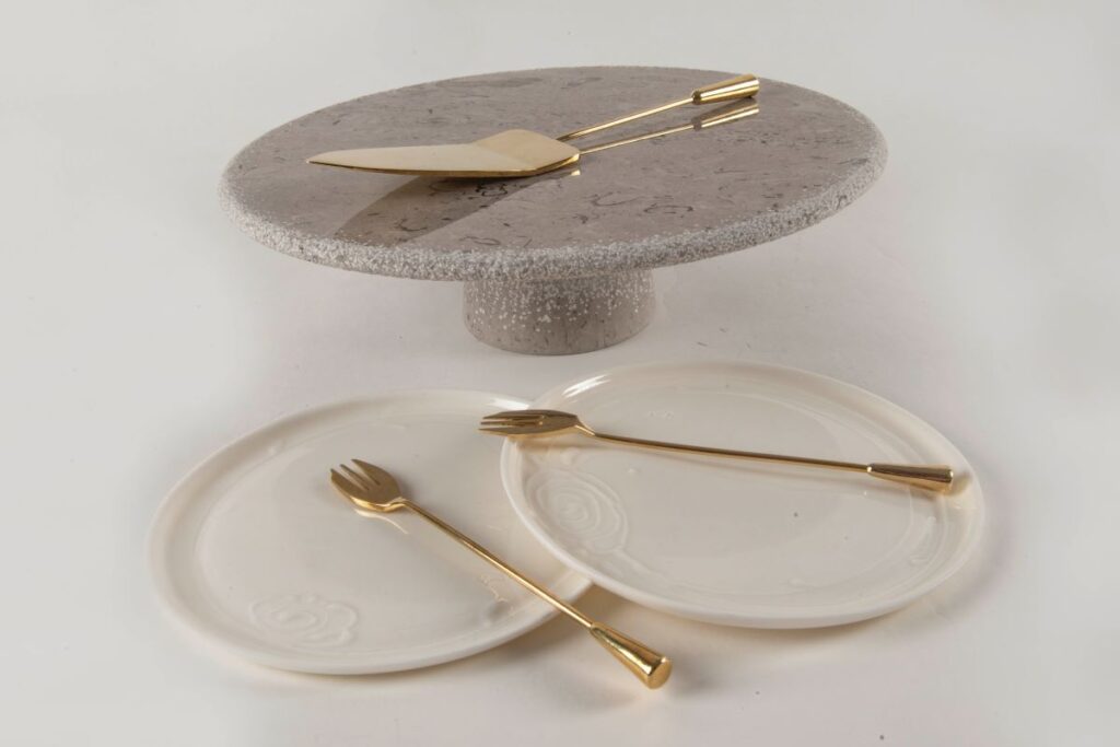 3. Primer uspešnega sodelovanja rokodelstva in oblikovanja, ki sloni na dediščinski tematiki: Urchic+Stories of Silver+Unikam so skupaj ustvarili darilni set iz kraškega kamna, medenine in porcelana, ki v svojih oblikah, navdihu in materijah izpričuje bogastvo Fabianijeve kulturne dediščine.