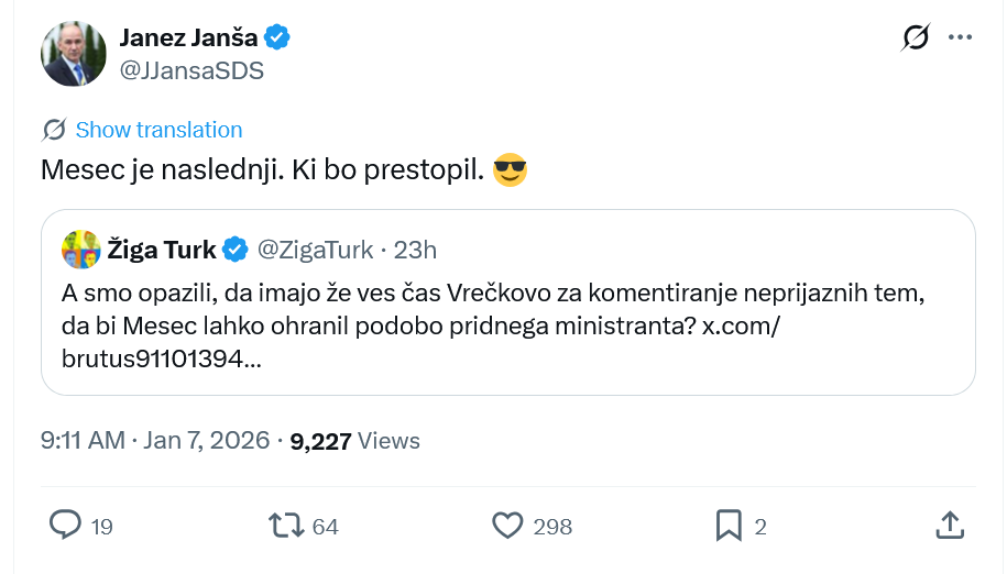 Predsednik SDS Janez Janša meni, da bo to Luka Mesec, eden od dveh koordinatorjev Levice in strankin ne preveč uspešen minister za delo. Janša se je namreč včeraj odzval na zapis Žige Turka na družbenem omrežju X, v katerem je Turk ugotavljal, da v Levici na komentiranje neprijaznih tem vseskozi uporabljajo kulturno ministrico Asto Vrečko, sicer drugo koordinatorico stranke. Ob tem se je vprašal, ali morda to počno zato, da bi Mesec “lahko ohranil podobo pridnega ministranta”. Na zapis se je odzval Janša in dodal: “Mesec je naslednji. Ki bo prestopil.”