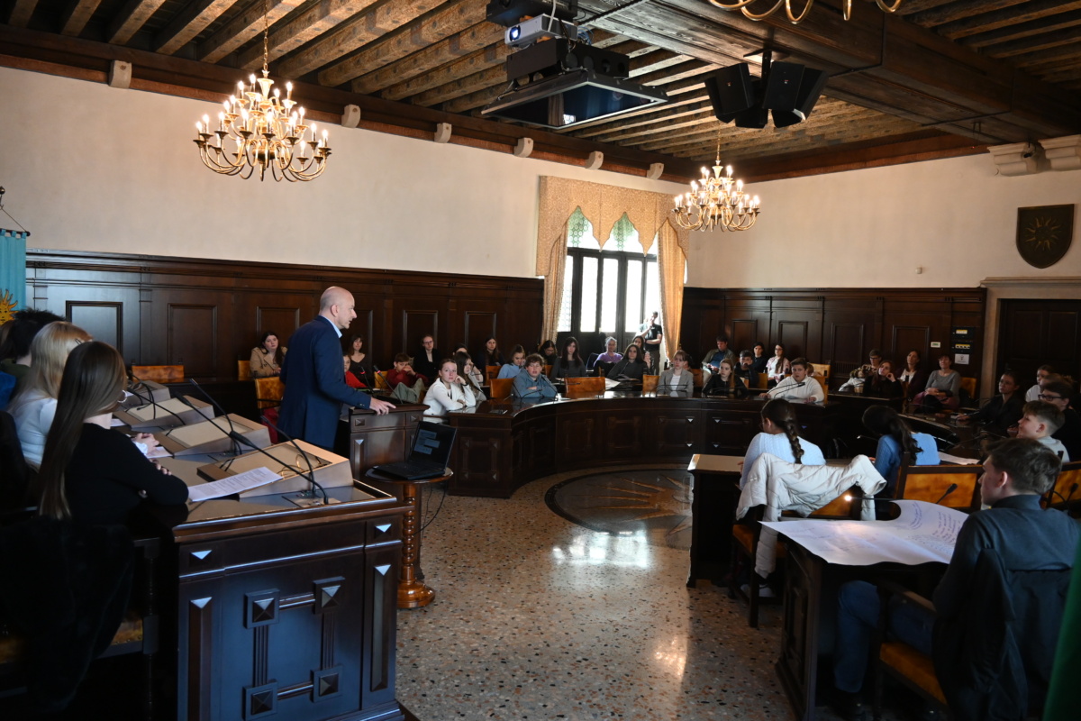 V sejni dvorani Pretorske palače v Kopru je danes potekal 36. medobčinski otroški parlament. Mlade parlamentarke in parlamentarci osnovnih šol Mestne občine Koper in Občine Ankaran ter Društva prijateljev mladine Koper so letos razpravljali na temo šolskega sistema. Udeležence 36. medobčinskega otroškega parlamenta je v sejni dvorani Pretorske palače pozdravil tudi Timotej Pirjevec, vodja Urada za družbene dejavnosti Mestne občine Koper.