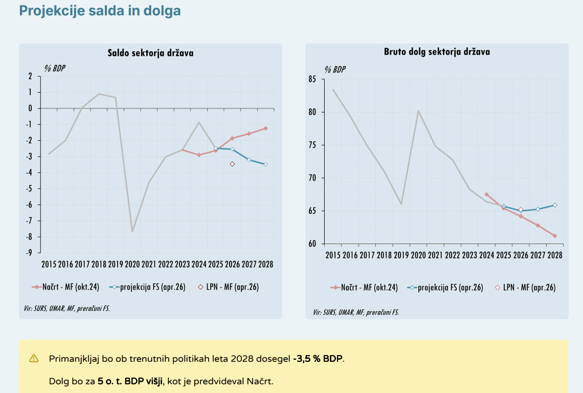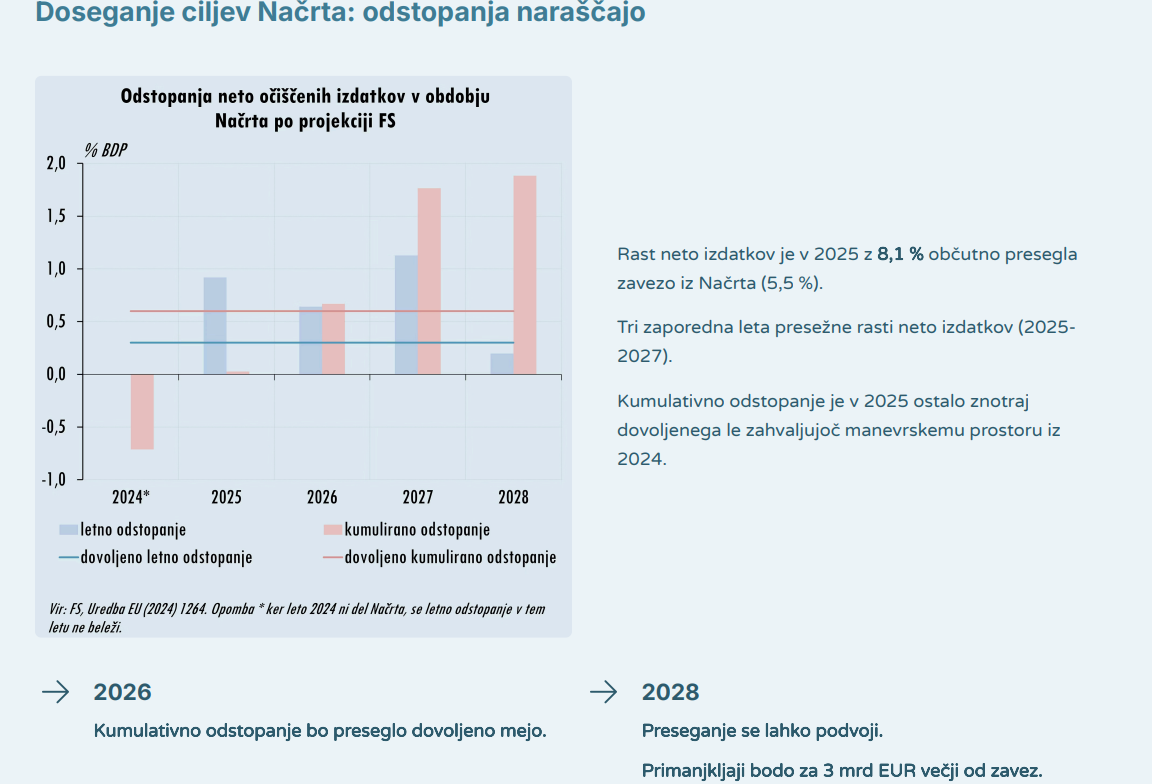 Rast očiščenih izdatkov v letu 2025 je dosegla 8,5 odstotka namesto načrtovanih 5,6 odstotka, za leto 2026 pa se napoveduje 8,2 odstotka namesto 4,4 odstotka. Kumulativno odstopanje od sprejetega srednjeročnega načrta bo že letos preseglo dovoljeno mejo, do leta 2028 pa se lahko podvoji. Posledično bi primanjkljaj brez ukrepanja narasel na minus 3,5 odstotka BDP, v najhujšem geopolitičnem scenariju pa celo na minus 5 odstotkov.