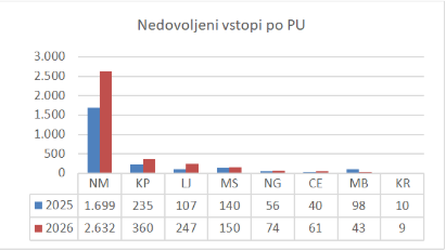 Začetek leta 2026 prinaša nov porast nezakonitih prehodov slovenske državne meje. Po podatkih Policije je bilo v prvih dveh mesecih zabeleženih 3.576 nedovoljenih vstopov, kar je polovico več kot lani, pri čemer skoraj tri četrtine vseh primerov obravnava Policijska uprava (PU) Novo mesto na balkanski migracijski poti.