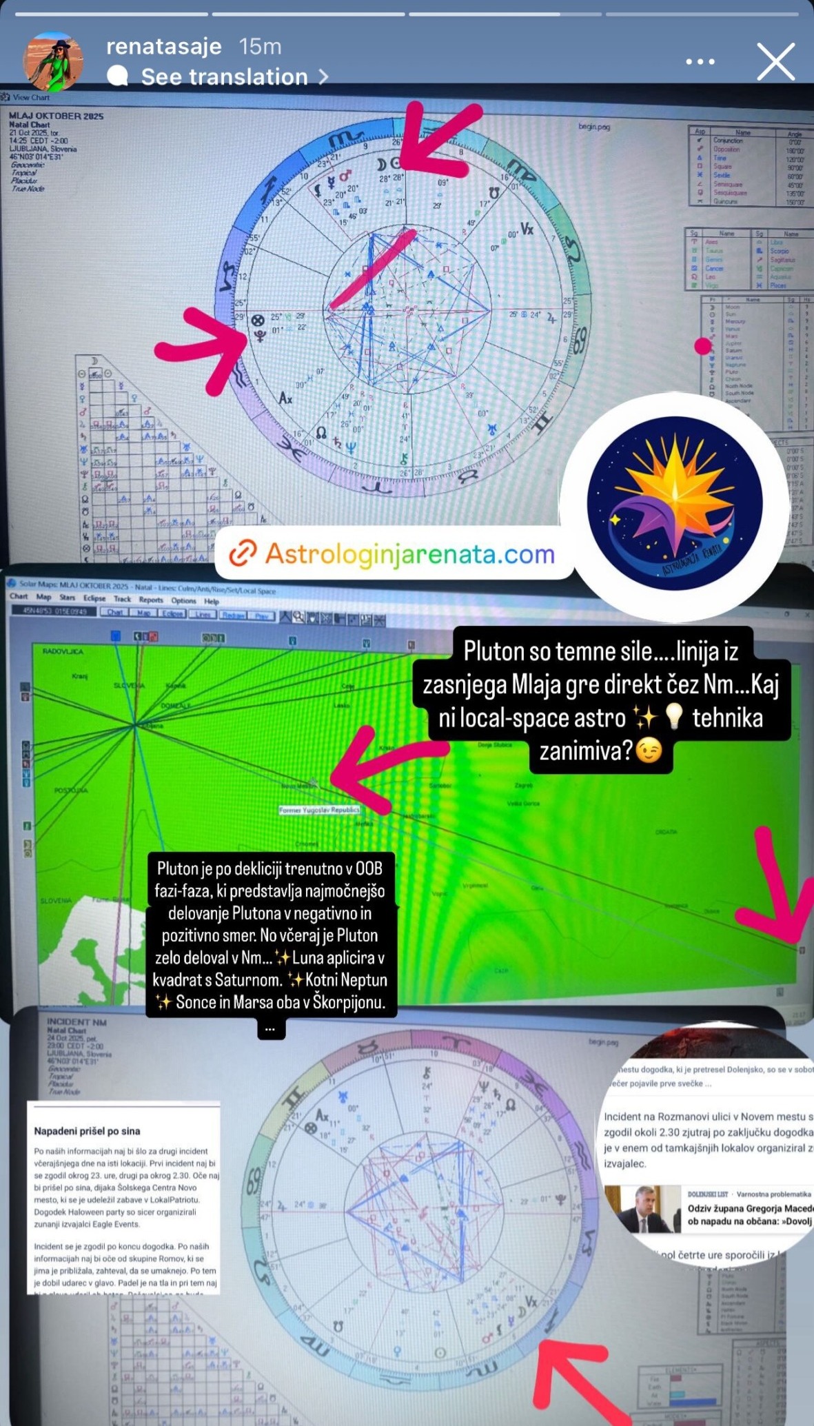Renata je v naslednjih objavah delila še astrološko karto, ki jo je povezala z dogodkom v Novem mestu. »Pluton so temne sile … linija iz zasneženega Mlája gre direktno čez Novo mesto. Kaj ni local-space astro tehnika zanimiva?« je zapisala ob sliki, kjer je prikazala planetarne lege in astrološke vplive. Pojasnila je, da je bil Pluton po deklici (astrološko karti) trenutno v fazi, ki prinaša najmočnejše delovanje v negativno in pozitivno smer, pri čemer je »včeraj Pluton deloval v Novem mestu«. »Luna aplicira v kvadrat s Saturnom. Kotni Neptun. Sonce in Marsa oba v Škorpijonu,« je navedla v svoji astrološki razlagi, s katero je želela ponazoriti, da so bili po njenem mnenju planetarni vplivi tisti, ki so spodbudili napetosti in nasilje.