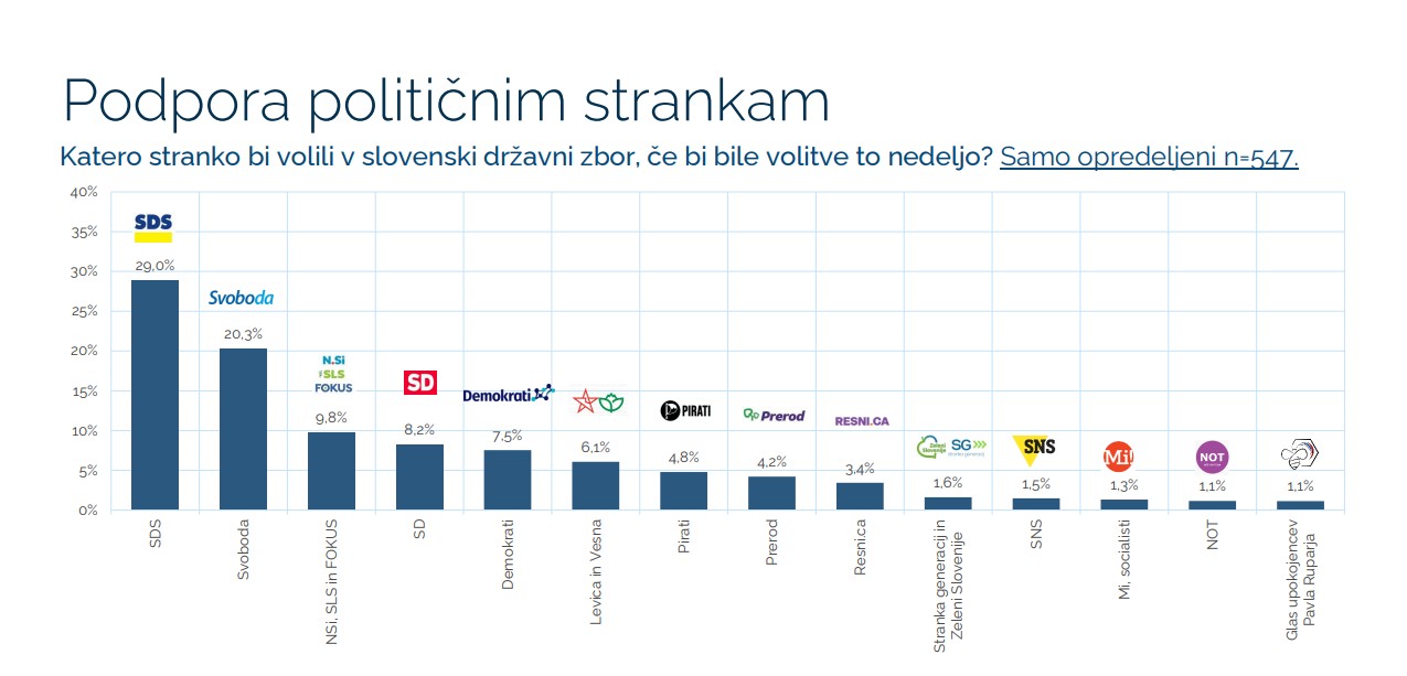 Vir: ParsifalNa vprašanje “Katero stranko bi volili v slovenski državni zbor, če bi bile volitve to nedeljo?” (Samo opredeljeni n=547) pa so bili odgovori sledeči: med opredeljenimi, bi SDS dobila 29,0 %, Svoboda 20,3 % ter združene NSi, SLS in Fokus 9,8 %.