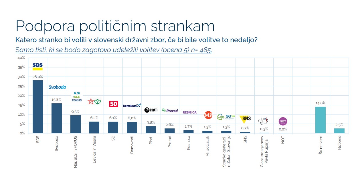 Vir: ParsifalNa vprašanje “Katero stranko bi volili v slovenski državni zbor, če bi bile volitve to nedeljo?” (samo tisti, ki se bodo zagotovo udeležili volitev (ocena 5) n= 485) pa so bili pridobljeni sledeči rezultati: med tistimi, ki se bodo zagotovo udeležili volitev, bi jih največ (28,0 %) podprlo SDS, sledi Svoboda (15,8 %), združene NSi, SLS in Fokus (9,5 %), združeni Levica in Vesna (6,2 %), SD (6,1 %) in Demokrati (6,0 %).