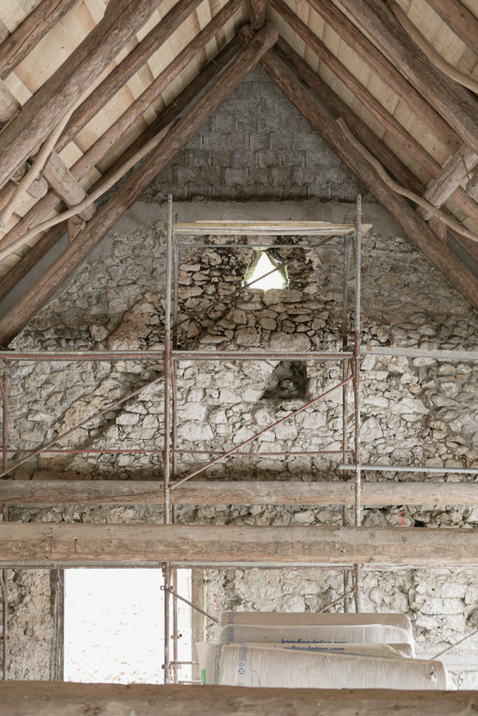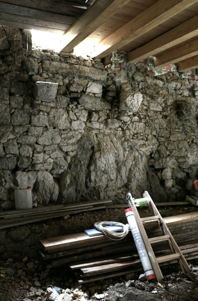 Drugi je toplotni ovoj, ki ga je treba zagotoviti za bivalno ugodje. Tu se pojavi dilema, saj dodajanje izolacije pomeni, da kamnita konstrukcija ni več vidna. V tem primeru smo se zato odločili za zajetno količino izolacije v predelu ostrešja in proti terenu, obodne stene pa bodo ostale takšne kot nekoč – zgolj kamnite, fugirane ali ometane.