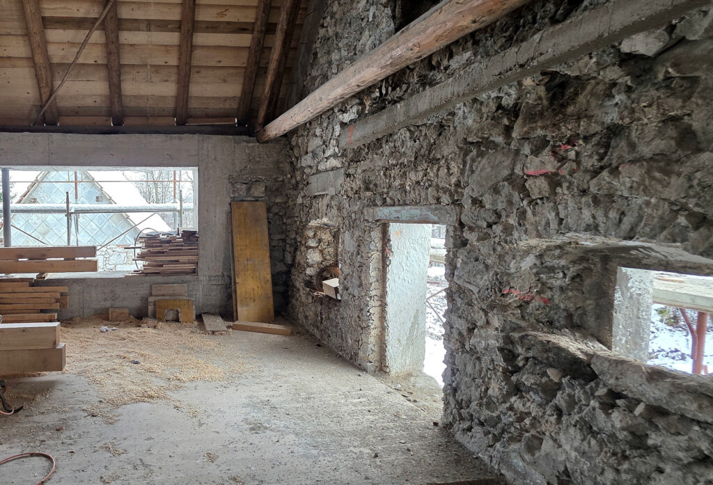 Eden izmed izzivov, ki se pri prenovi starejših objektov vedno pojavi, je tudi utrditev obstoječe konstrukcije. Tu smo jo izboljšali z injektiranjem, povezali z betonsko vezjo in sidrali v medetažno konstrukcijo. Ekipa, ki je izvajala injektiranje sten, je to izvedla posebej skrbno, da smo na stenah lahko obdržali vidni kamen.