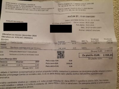 V torek, 13. 1. 2026, je na dom prispela prva položnica s pričakovanim nižjim plačilom. A sledil je šok: 2.068,00 €. Dosedanji znesek je znašal 1.486,00 €. “Sedaj me zanima, s kakšnim razlogom se je sploh cena dvignila? In zakaj oče ni bil vključen v tako lepo opevan Zakon o dolgotrajni oskrbi? Kakšnih dodatnih oziroma posebnih storitev je bil oče deležen v decembru za takšen drastičen dvig cene? Kaj se je v enem mesecu spremenilo, glede na to, da dom niti nima usposobljenega in strokovnega kadra za skrb invalidov?” se sprašuje naša sogovornica.