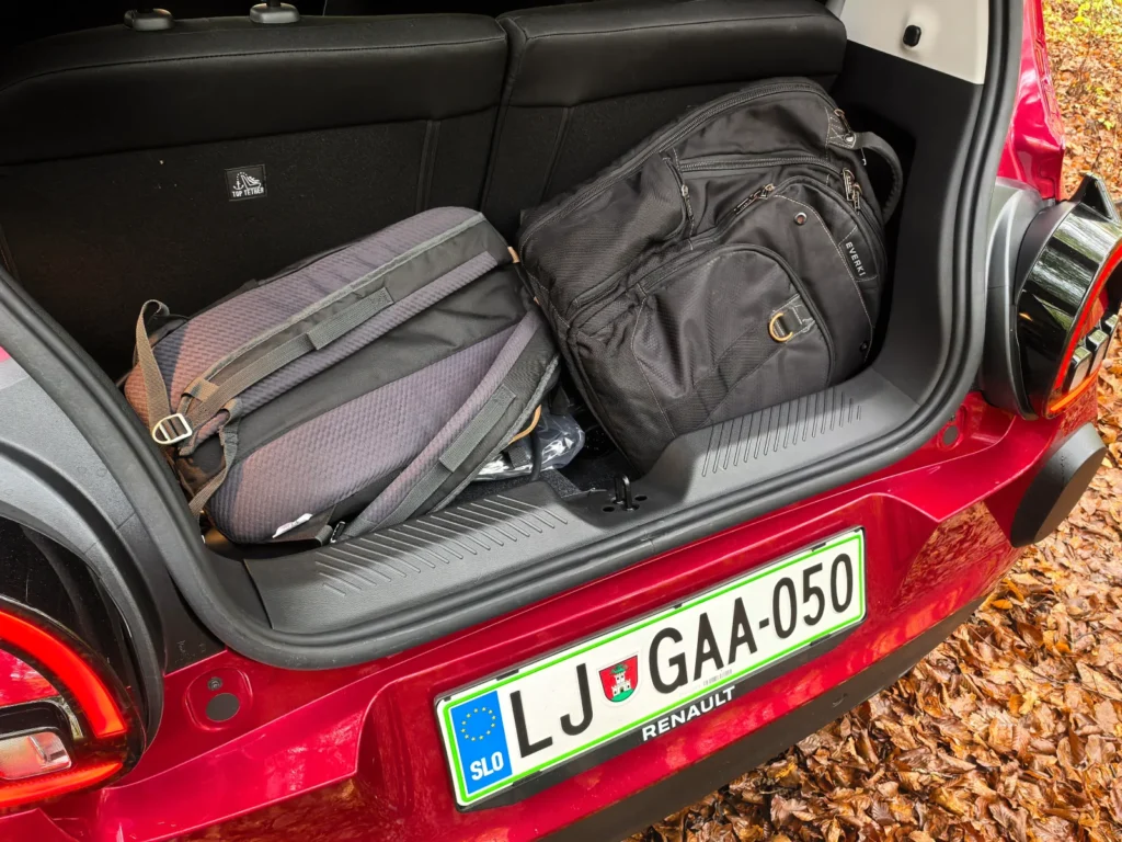 Začenši s prostorom. Razumljivo je, da ga v kabini ni na odveč. Dokler fiziki ne bodo iznašli formule, ki bo dovolila gradnjo objektov, ki bodo znotraj večji od zunanjih mer, so kompromisi nujni. Nič hudega, če sem malce zašel v polje znanstvene fantastike. Nenazadnje nedolgo tega nismo verjeli, da je mogoče skupaj zmetati električni avtomobil z relativno, poudarjam relativno, dovoljšnim dosegom in ceno pod dvajset tisočakov. Dodajmo temu še subvencijo in jasno postane, zakaj je malček tako zelo zanimiv. Vrnimo se k prostornosti. Spredaj ga je dovolj, zadaj manj. Zadnja sedeža lahko premakneš nazaj ali naprej za sedemnajst centimetrov, a potem v 260-litrski prtljažnik stlačite bore malo. Prostornina skoči na 360 litrov, če sedeža premakneš naprej, a tedaj zadaj odrasli osebi težko sedita. Zaradi majhne razdalje do sprednjih sedežev in ne višine do stropa, ki se mi je zdela za vozilo te kategorije nadpovprečna.