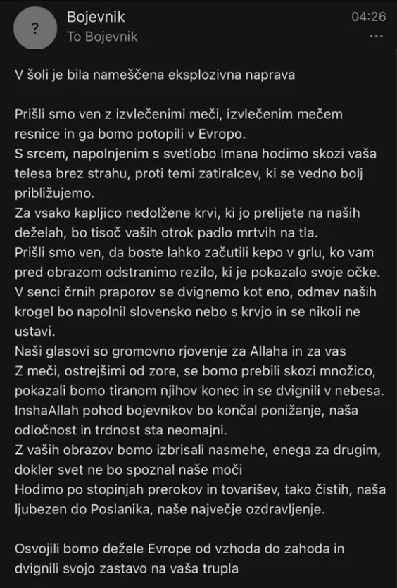 Na več osnovnih in srednjih šolah po Sloveniji so danes prejeli elektronska sporočila z varnostno grožnjo. V uredništvo smo prejeli vsebino grozilnega sporočila, ki je izjemno nasilna ter radikalizirana in vsebuje islamistično ter teroristično retoriko. Nekatere šole so odločile za evakuacijo, drugje pa pouk poteka nemoteno. Policija ocenjuje, da gre za nizko stopnjo tveganja, a primer kljub temu obravnava kot kaznivo dejanje povzročitve splošne nevarnosti.