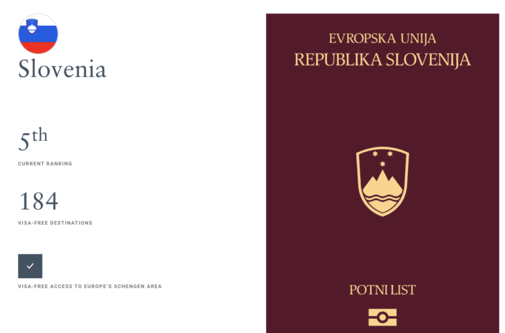 Slovenija se je uvrstila na 5. mesto, kar je najvišja uvrstitev v zadnjih 20 letih! Lani je bila na primer še na 10. mestu. Slovenski potni list prebivalcem omogoča brezvizumsko potovanje v 184 držav sveta. 5. mesto si sicer deli z Madžarsko, Portugalsko, Slovaško in Združenimi arabskimi emirati (UAE).