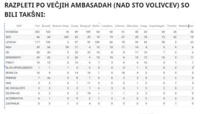 SDS je sicer po podatkih Spletnega časopisa slavila tudi v Torontu. V Beogradu in Bruslju je slavilo Gibanje Svoboda, v Londonu in Berlinu pa Levica. Skupna lista Levice in Vesne je, sodeč po rezultatih na vseh ambasadah (tudi manjših), na presenečenje marsikoga premagala SD; s 827 glasovi se je namreč uvrstila za Svobodo s 1153 glasovi in SDS s 902 glasovi.