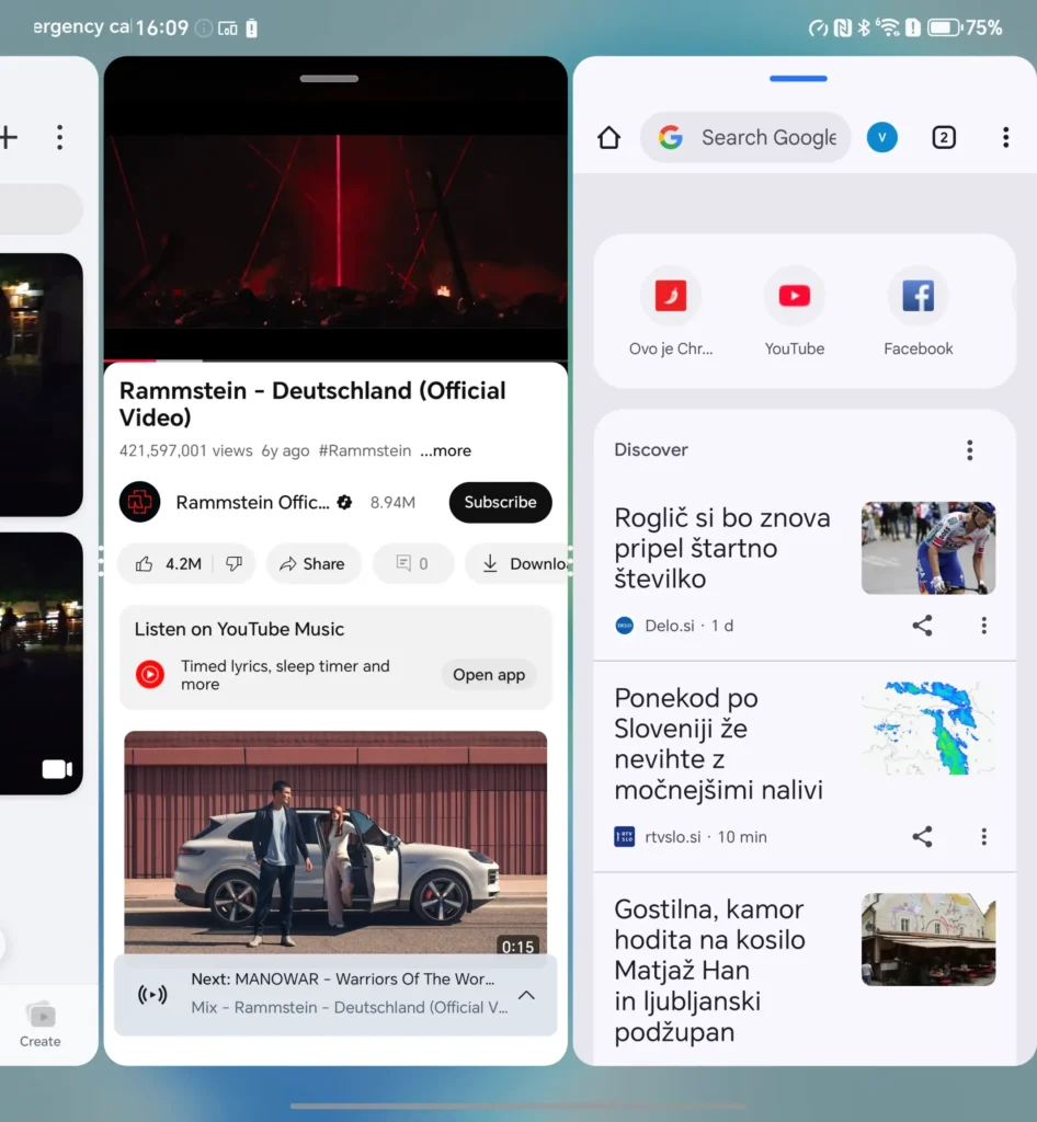 A roko na srce, zgolj zaradi boljših selfijev se redkokdo odloči za zložljiv telefon. Prava vrednost HONOR Magic V5 se skriva drugje. To je sposobnost, da hkrati uporabljamo tri aplikacije, po potrebi pa dodamo še eno v plavajočem oknu. Na običajnem pametnem telefonu bi bilo kaj takega nepredstavljivo, a velik notranji zaslon omogoča resnično večopravilnost. Posebnost pri tem modelu je tudi način razporeditve aplikacij, saj sta dve prikazani večji, medtem ko je tretja na levi ali desni strani nakazana. Tako ima tisto opravilo, ki ga trenutno izvajamo, vedno dovolj prostora, kar močno poveča produktivnost.