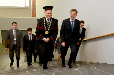 Miro Cerar mlajši ob dnevu slovesnost ob dnevu Pravne fakultete Univerze v Ljubljani, v ozadju Nejc Brezovar, foto: STAZanimalo nas je predvsem ali Cerar in fakulteta obsojata Brezovarjeve besede iz prisluhov, kjer je videti, da normalizira kopcijska dejanja, fakulteto pa smo še dodatno prosili, ali bo proti profesorju sprožila kakšno preiskavo ali disciplinski postopek.
