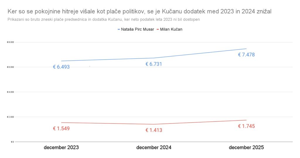 Daljša primerjava pokaže nenavadnost, da se je predsedniški dodatek med leti 2023 in 2024 Kučanu celo znižal.