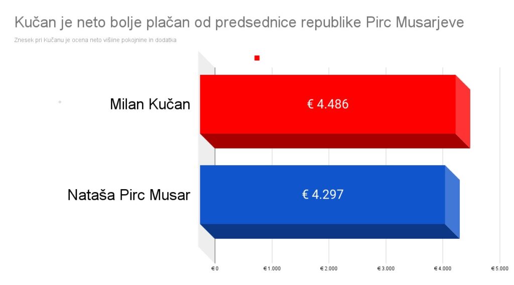 Razlog za to je bil, ker so se takrat bolj kot plače politikov višale pokojnine. Zdaj se je to z najnovejšo reformo plač funkcionarjev obrnilo in gre funkcionarjem spet bolje kot upokojencem. Vsi podatki o bruto in neto plačah in dodatkih ta mesec in pred letom za Kučana in Pirc Musarjevo, ki so mi jih obakrat poslali iz kabineta predsednice, so takšni: