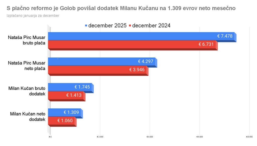 Primerjava s plačila ta mesec in pred letom pokaže, da je predsednica republike z reformo mesečno dobila 351 evrov neto več. Pred letom je dobila neto 3.946 evrov, zdaj neto 4.297 evrov. Kučan pa je dobil 249 evrov neto več dodatka, kar je visoka rast. Iz 1060 je plačilo poskočilo na 1309 evrov. Kučan ob dodatku (doplačilu), ki mu zagotavlja 80 odstotkov predsedniške plače, seveda dobiva še pokojnino.