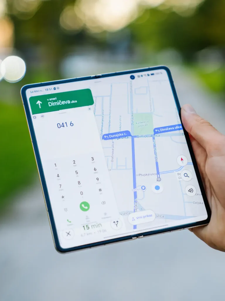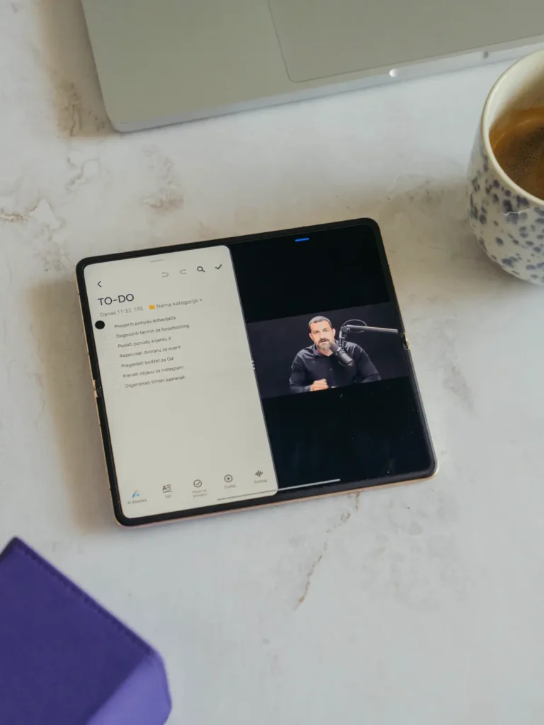 Zložljiv zaslon prinaša popolnoma novo uporabniško izkušnjo. Na velikem notranjem zaslonu lahko hkrati uporabljate tri aplikacije, razporejene drugo ob drugi. Po želji zaslon razdelite tudi po vodoravni osi, kar pomeni, da imate eno aplikacijo prikazano zgoraj in drugo spodaj. Takšna prilagodljivost močno izboljša produktivnost, saj omogoča nemoteno delo, brskanje po spletu in komunikacijo brez stalnega preklapljanja.